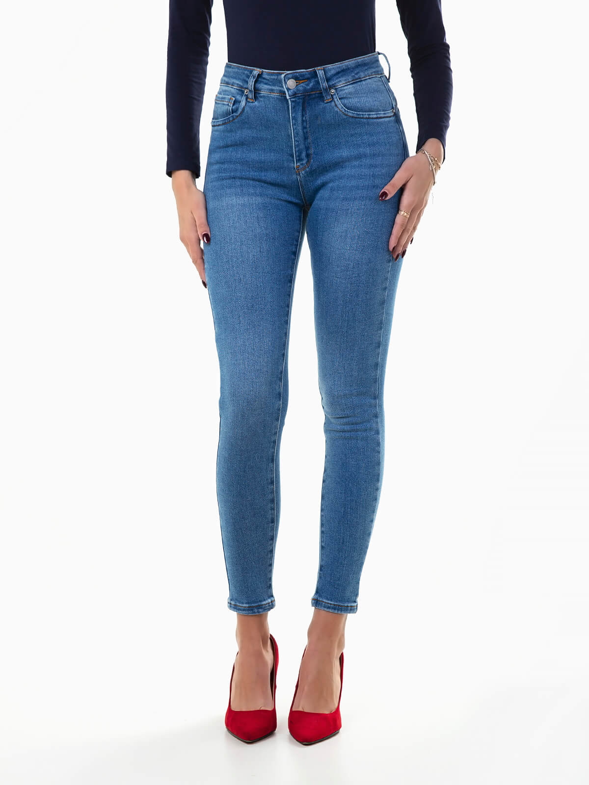 Calças ganga justas com efeito push-up. Skinny jeans elásticas de cintura alta com 5 bolsos. Aperto fecho éclair e botão. Lavagem azul claro.