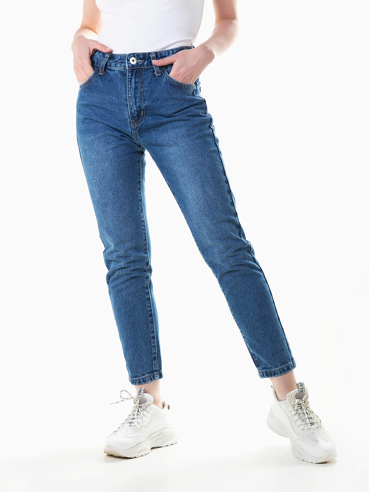 Calças ganga mom fit com lavagem azul escuro. Jeans de cintura alta com 5 bolsos. Aperto fecho éclair e botão.