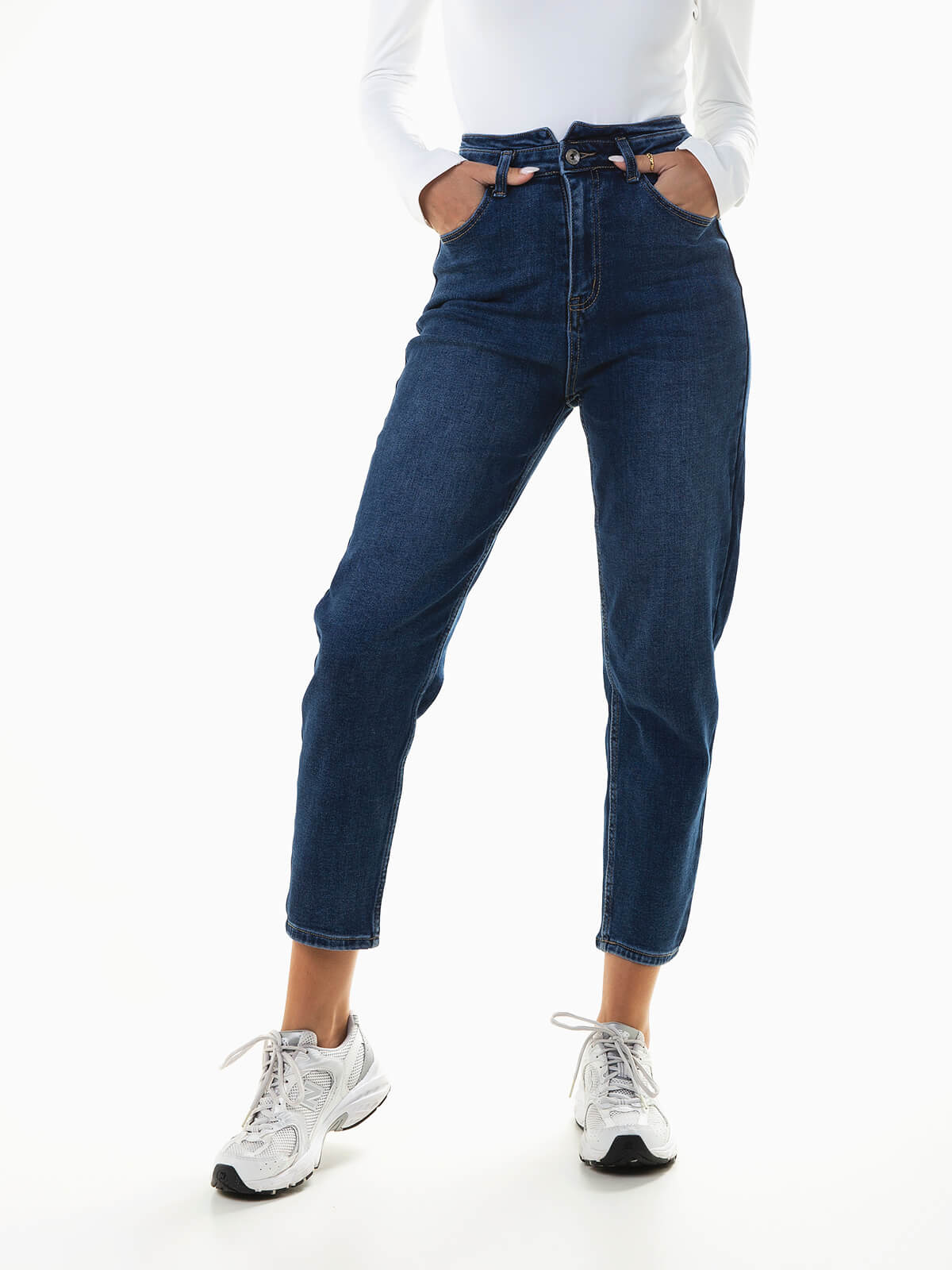Calças de ganga mom fit com lavagem azul escuro para mulher. Jeans de cintura alta com cinto duplo e 4 bolsos. Aperto fecho éclair e botão.