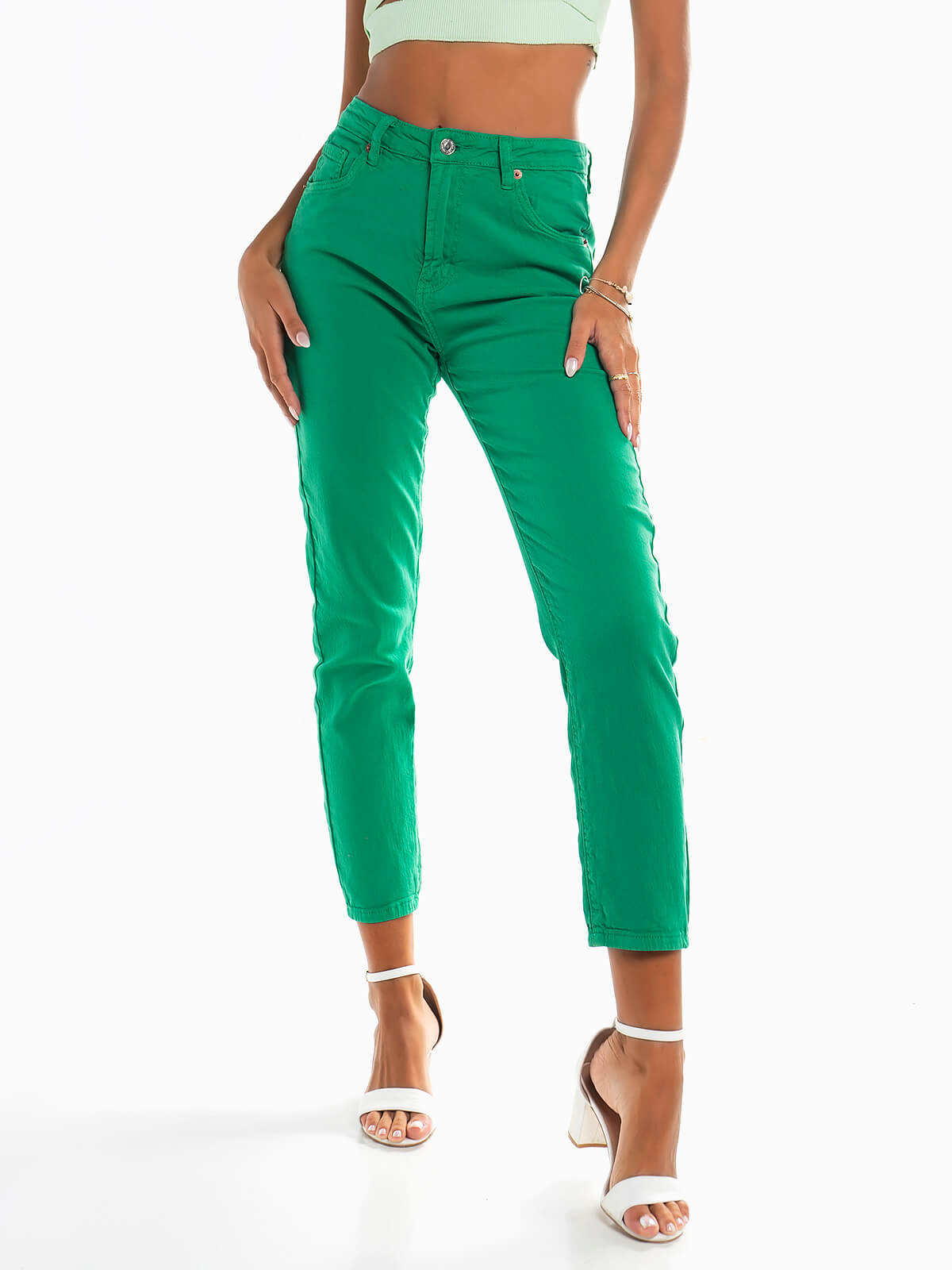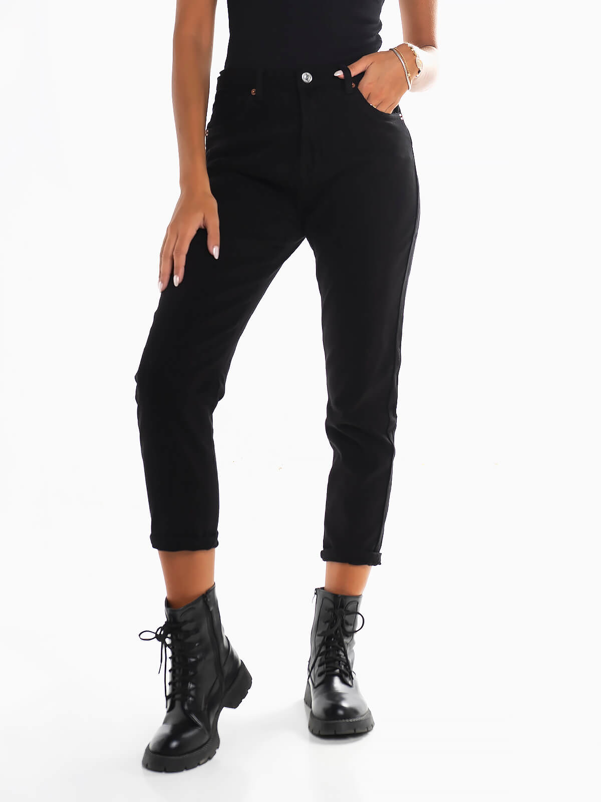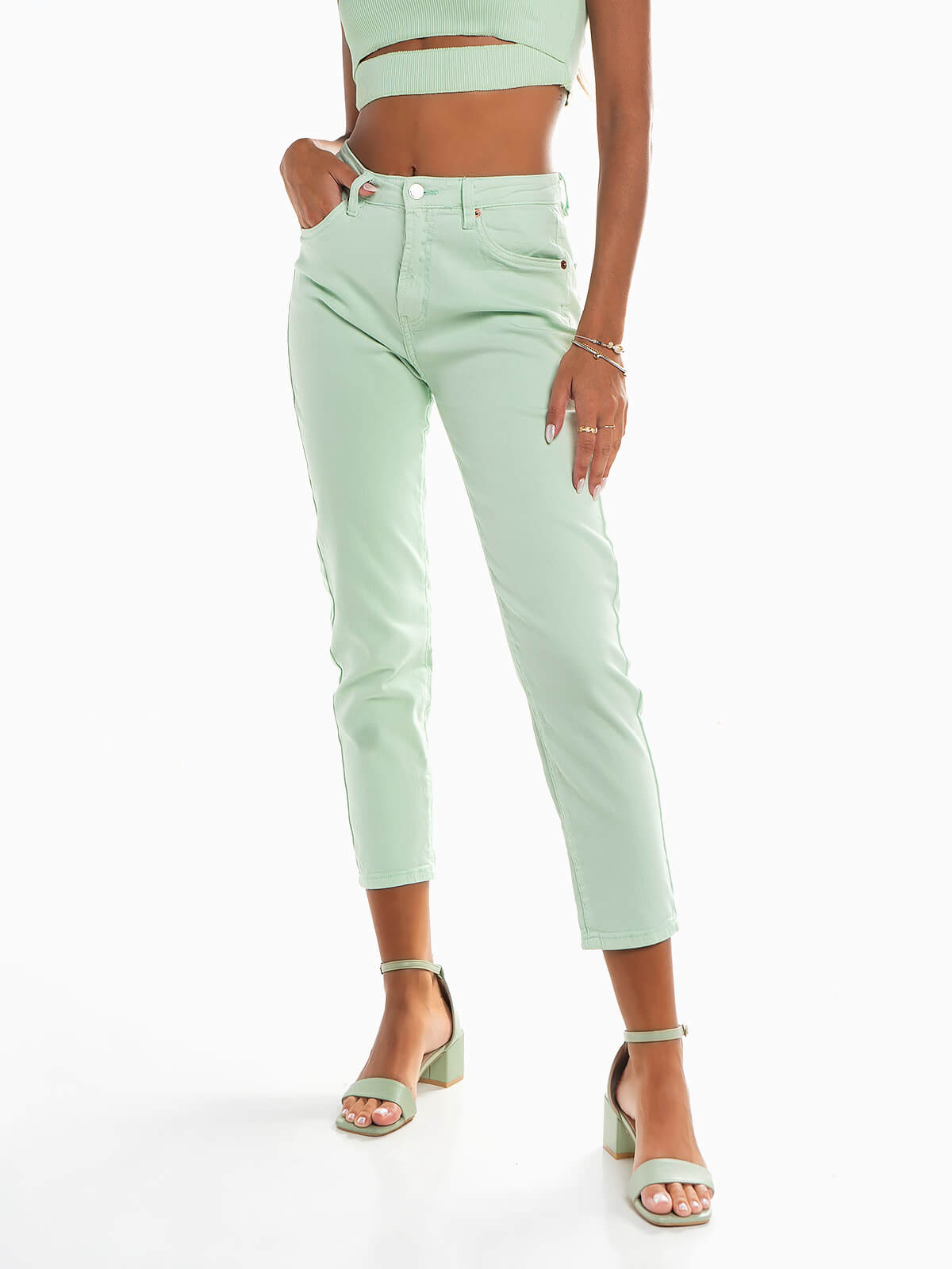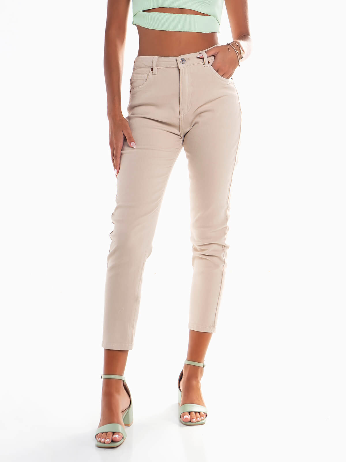 Calças ganga mom fit de cintura alta para senhora. Jeans com 5 bolsos. Aperto de fecho éclair e botão.
