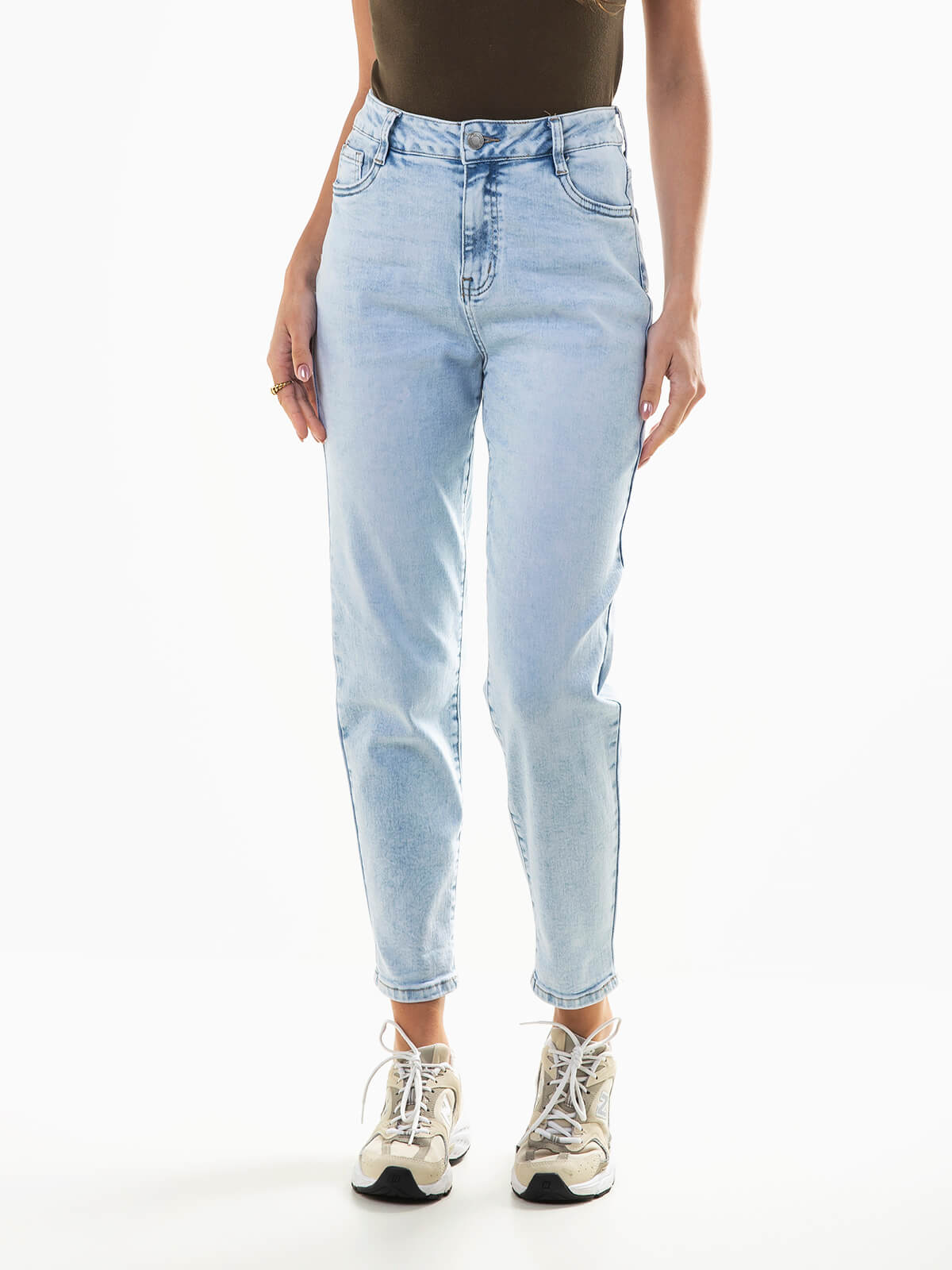 Calças de ganga mom fit ccom cintura alta e lavagem azul claro. Jeans para mulher com 5 bolsos. Aperto de fecho éclair e botão.