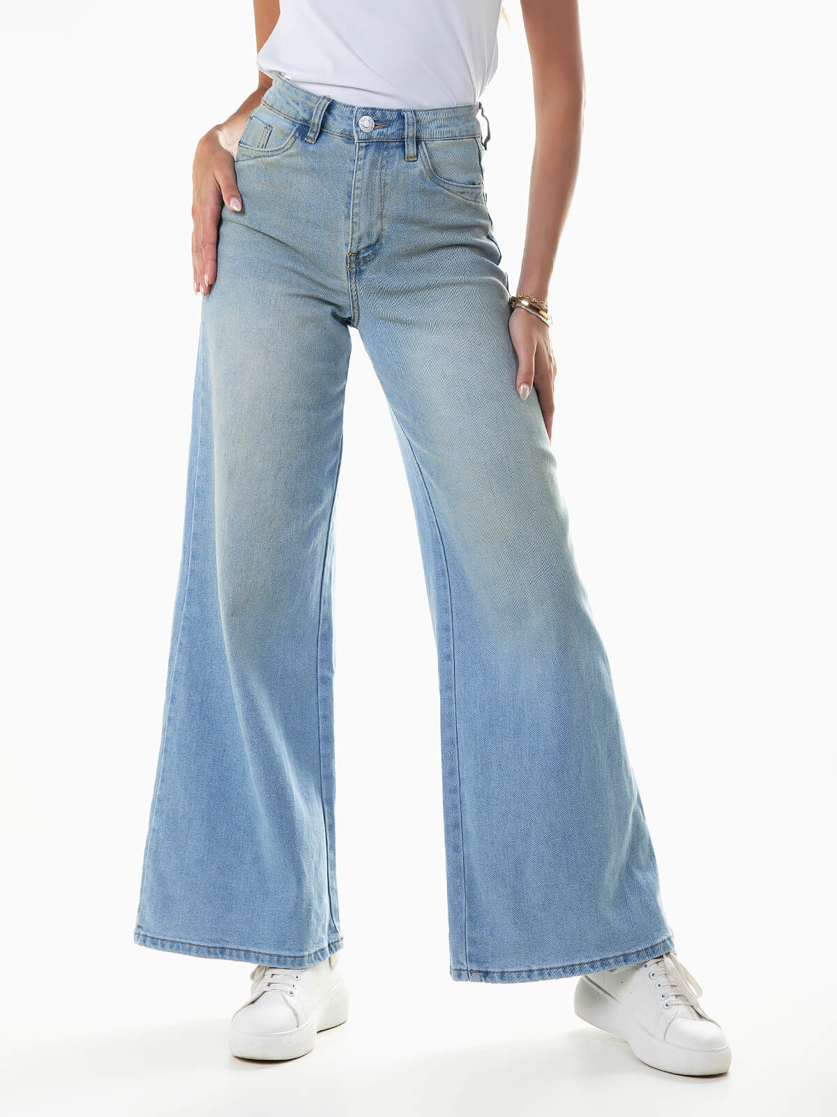 Calças ganga palazzo fit com lavagem azul claro vintage. Jeans largas de cintura alta com 5 bolsos. Aperto fecho éclair e botão.