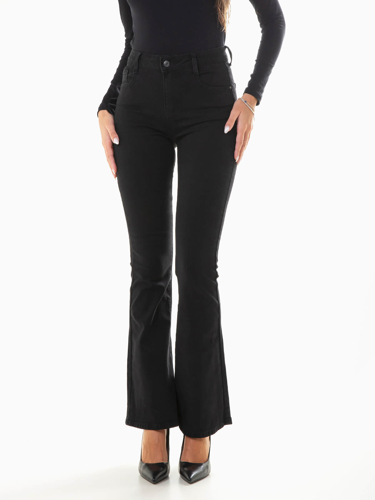 Calças ganga pretas à boca de sino para mulher. Calças elásticas de cintura alta com 5 bolsos. Aperto fecho éclair e botão.