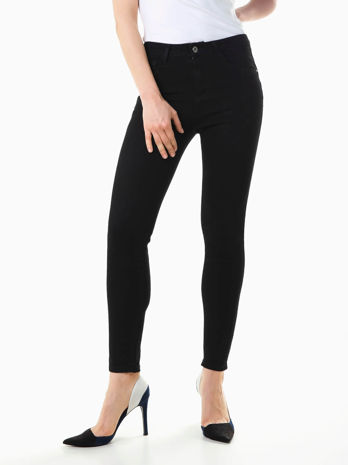 Calças ganga pretas efeito super push-up com cintura média para senhora. 5 bolsos. Aperto fecho éclair e botão.