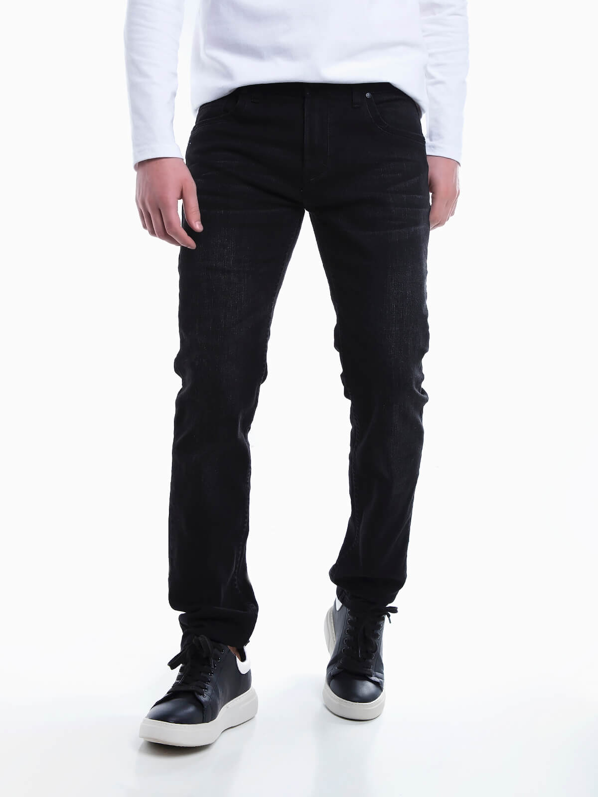 Calças de ganga pretas straight fit para homem. Jeans com elastano para maior conforto. 5 bolsos. Aperto de fecho éclair e botão.