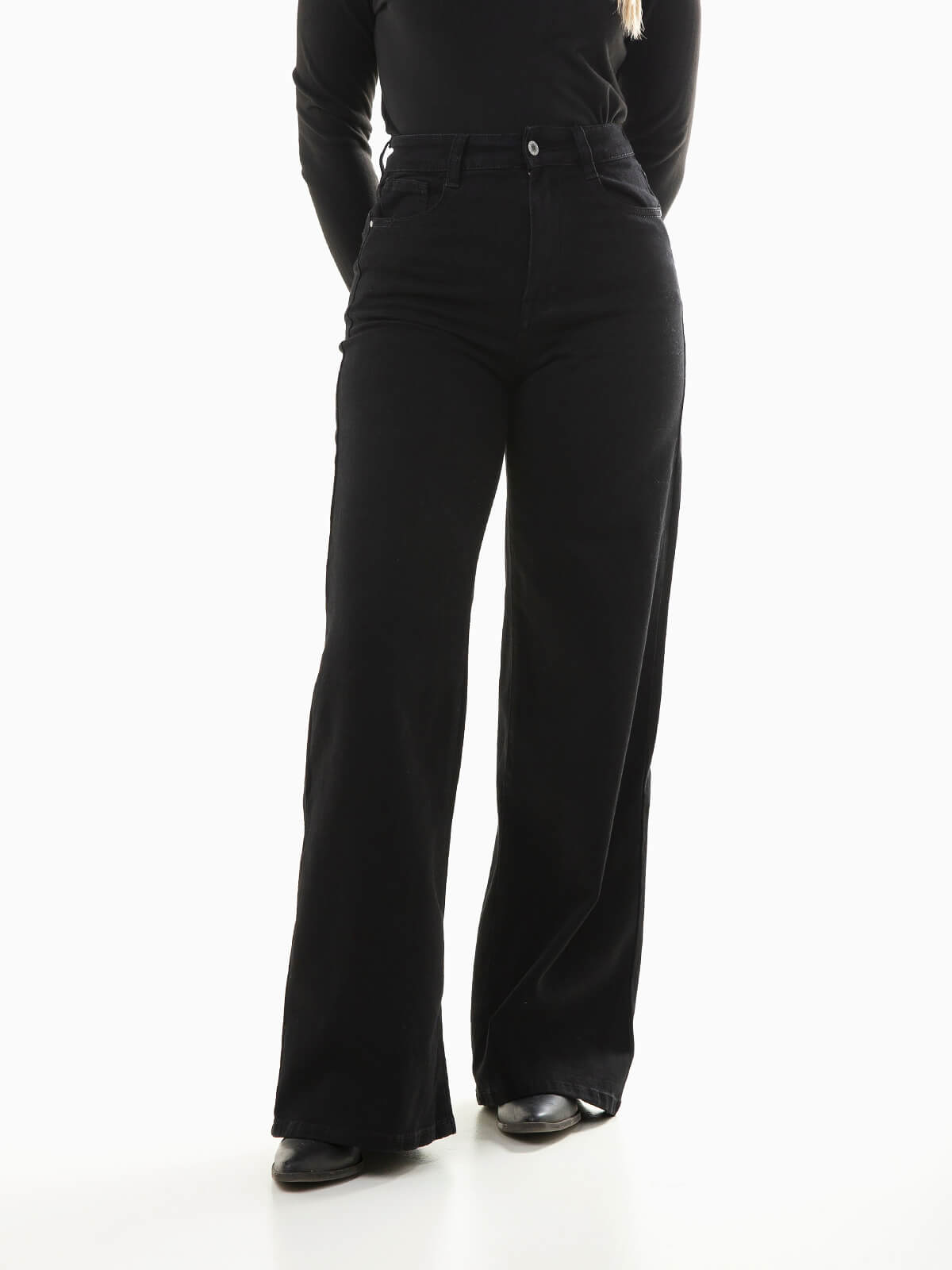 Calças de ganga pretas wide leg para senhora. Jeans de cintura alta com corte direito e 5 bolsos. Aperto fecho éclair e botão.