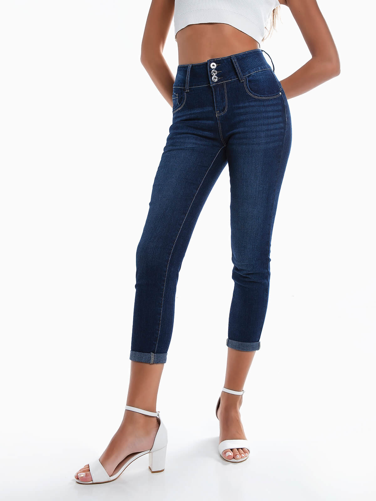 Calças de ganga com efeito push-up para senhora. Jeans elásticas de cintura alta com lavagem azul escuro. 5 bolsos. Aperto de fecho éclair e 3 botões.