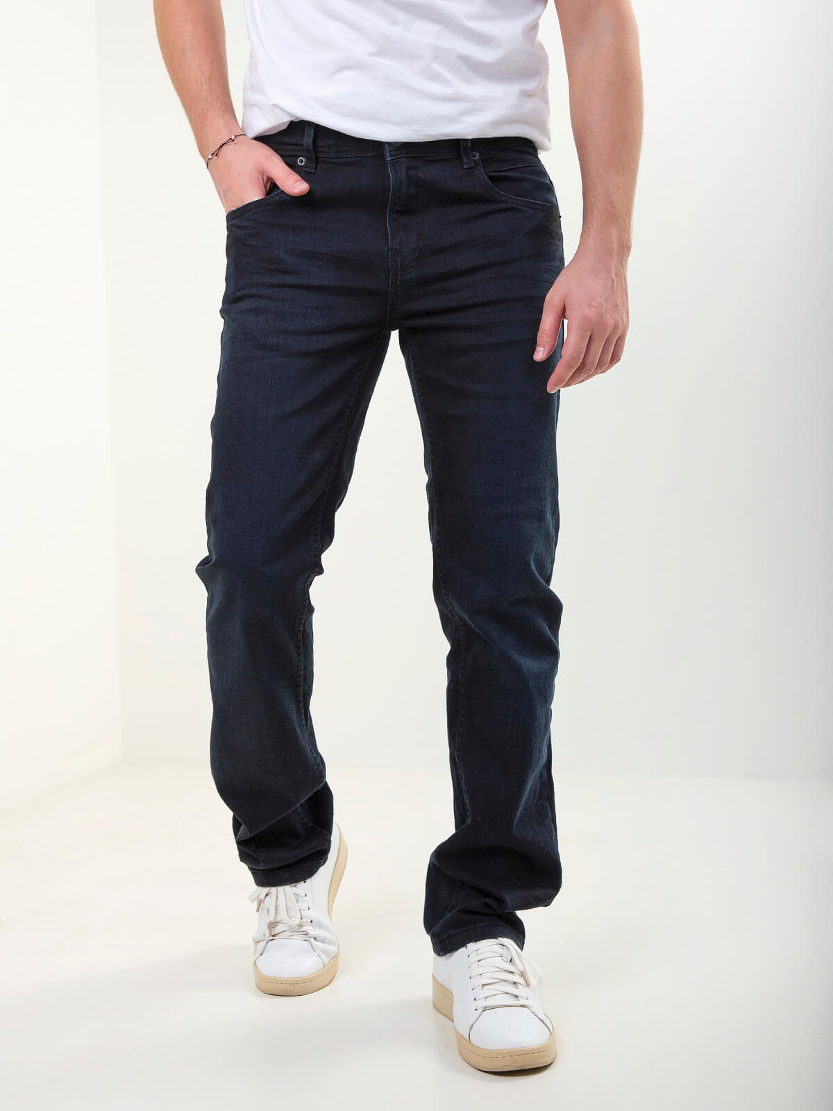 Calças de ganga regular fit para homem em azul escuro. Modelo elástico de 5 bolsos com fecho éclair e botão. Confortáveis e fáceis de combinar.