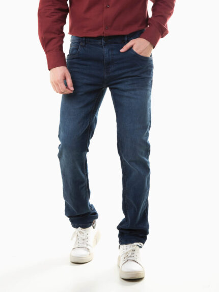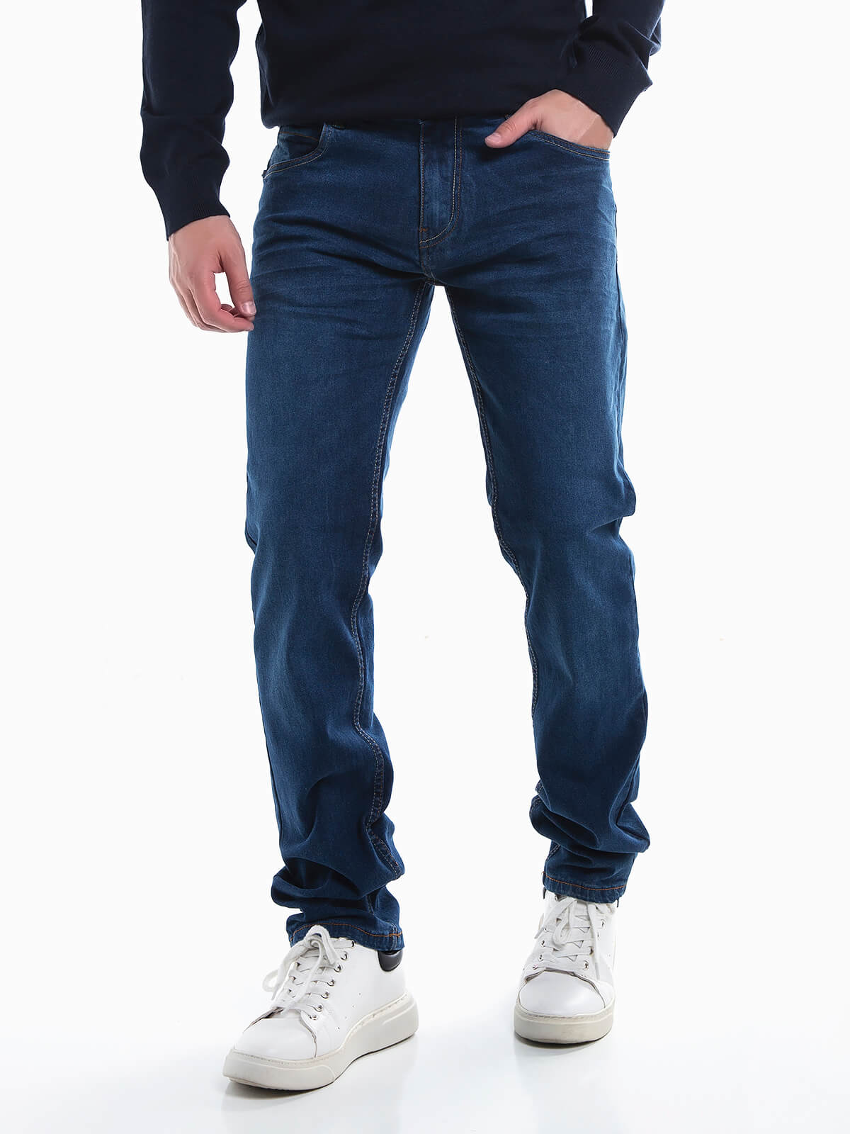 Calças de ganga corte regular para homem. Jeans elástica com lavagem azul escuro. 5 bolsos. Aperto fecho éclair e botão.