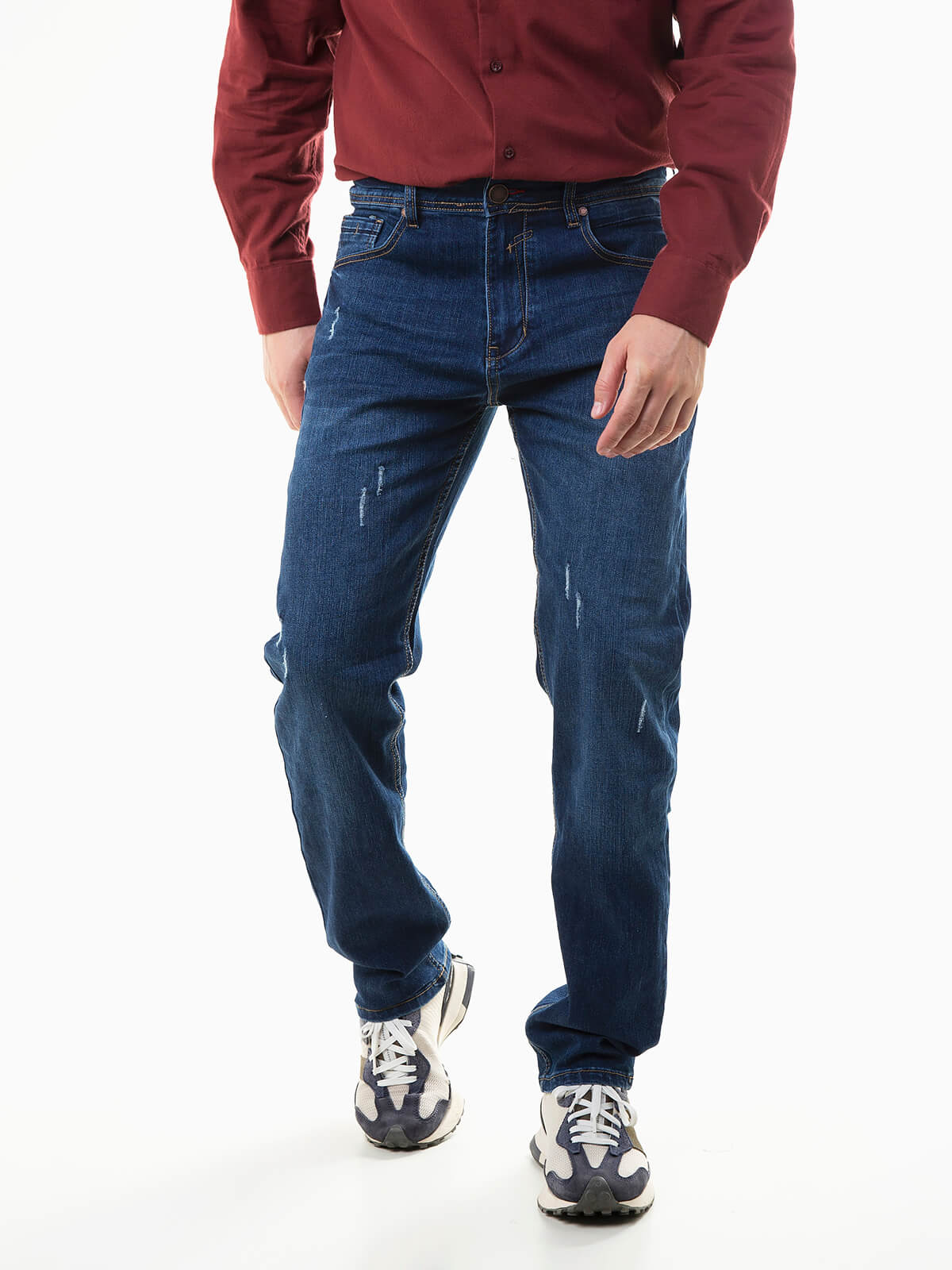 Calças de ganga regular fit com leves rotos para homem. Jeans de lavagem azul médio e 5 bolsos. Aperto fecho éclair e botão.