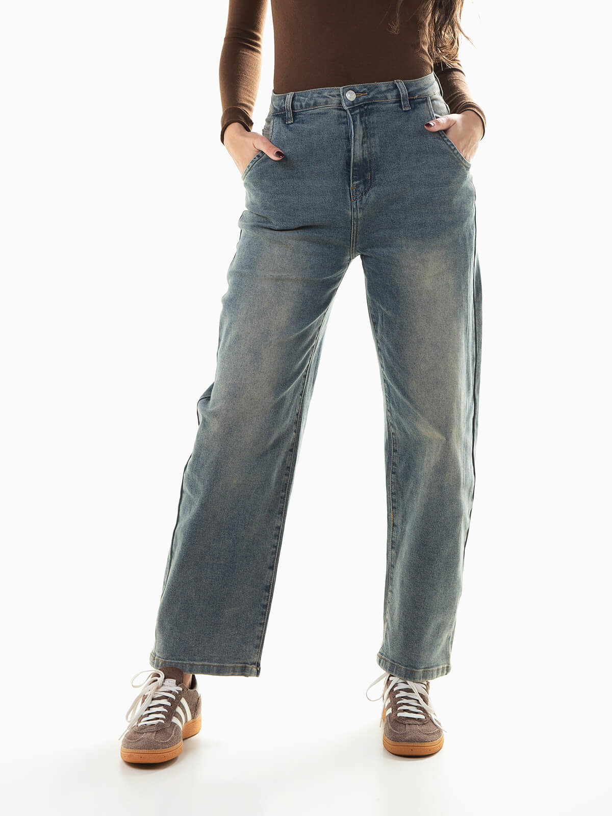 Calças de ganga skater com lavagem azul vintage. Jeans balloon de cintura alta com 5 bolsos. Aperto de fecho éclair e botão.