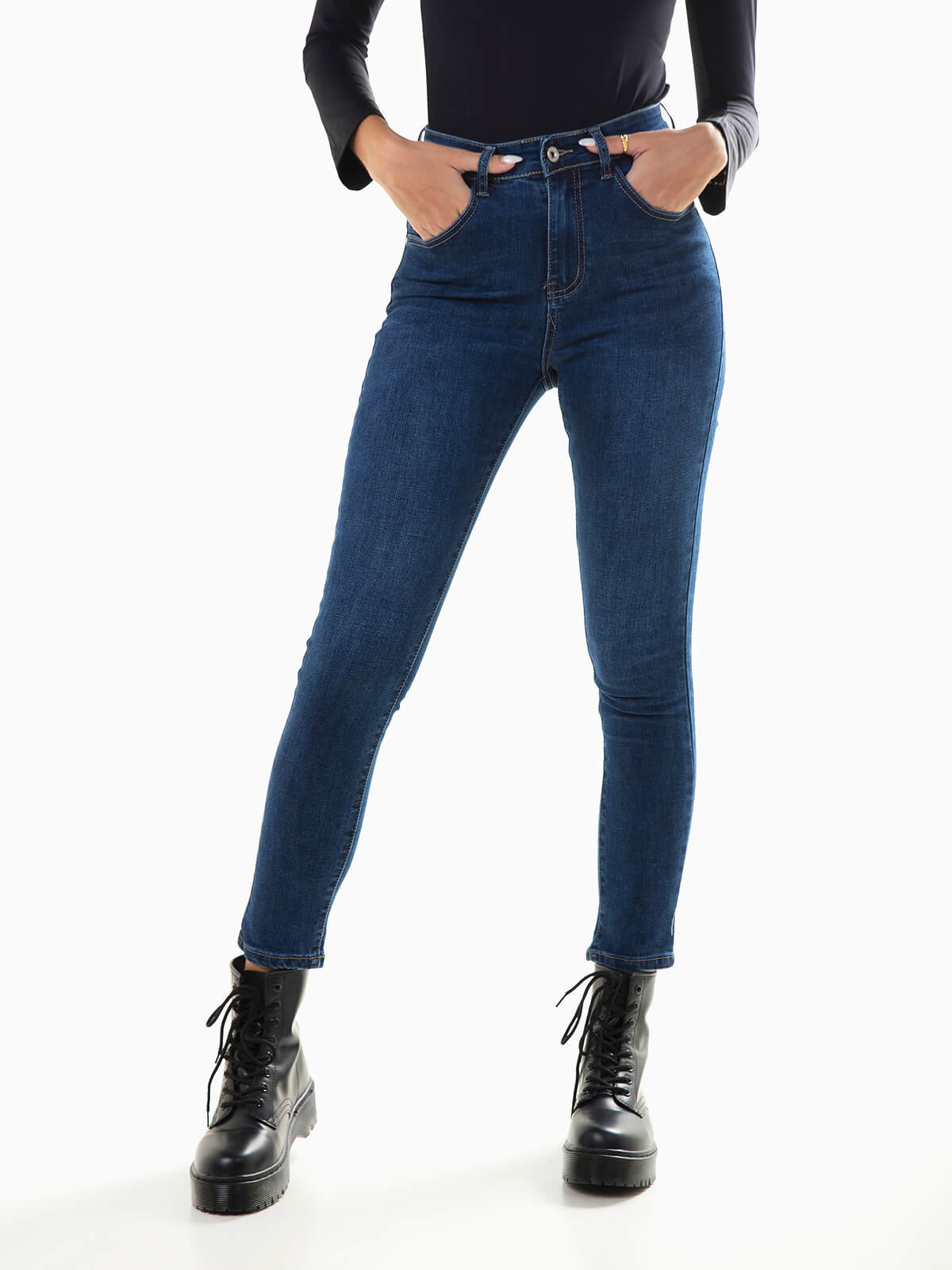 Calças ganga skinny com lavagem azul escuro para mulher. Jeans justas com cintura alta e 5 bolsos. Aperto fecho éclair e botão.