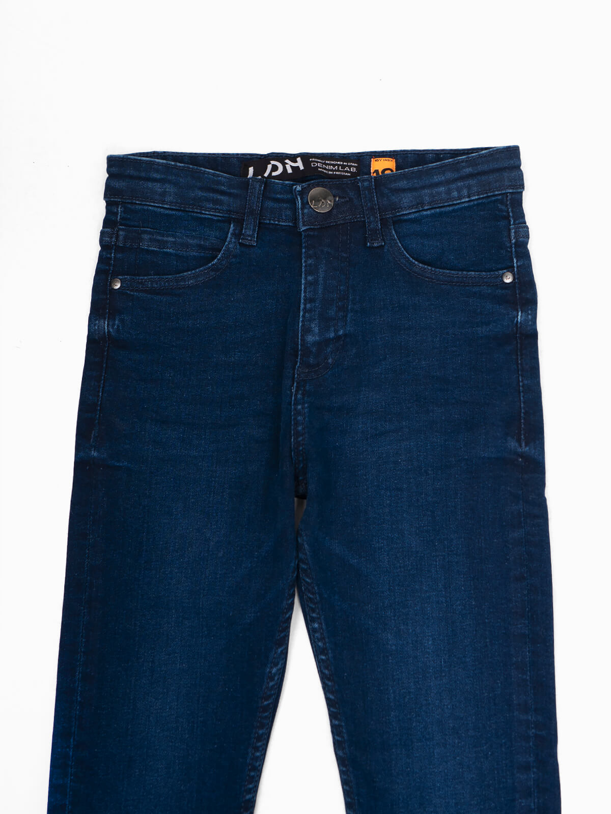 Calças de ganga skinny de lavagem azul escuro para menino. Comfort jeans com ajustador no interior. 5 bolsos. Aperto fecho éclair e botão.