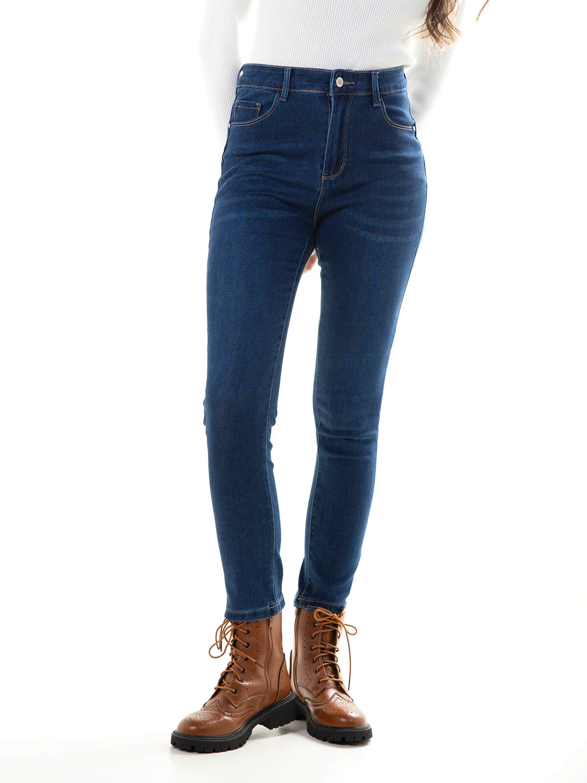 Calças ganga skinny com efeito ultra push-up para senhora. Jeans de cintura alta com lavagem azul escuro. 5 bolsos. Aperto fecho éclair e botão.