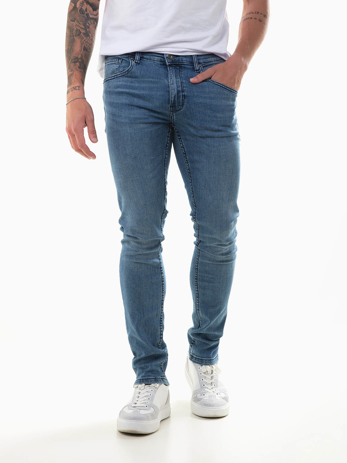 Calças de ganga skinny fit com lavagem azul médio para homem. Jeans com 5 bolsos. Aperto de fecho éclair e botão.