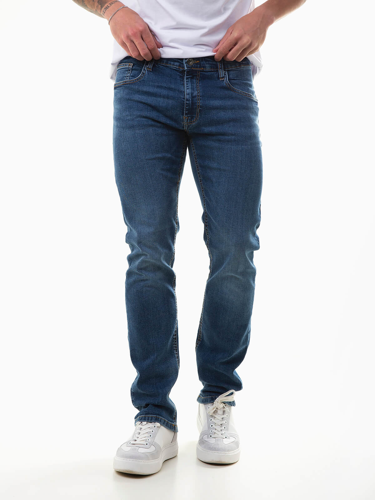 Calças de ganga slim fit com lavagem azul médio para homem. Jeans com 5 bolsos. Aperto de fecho éclair e botão.