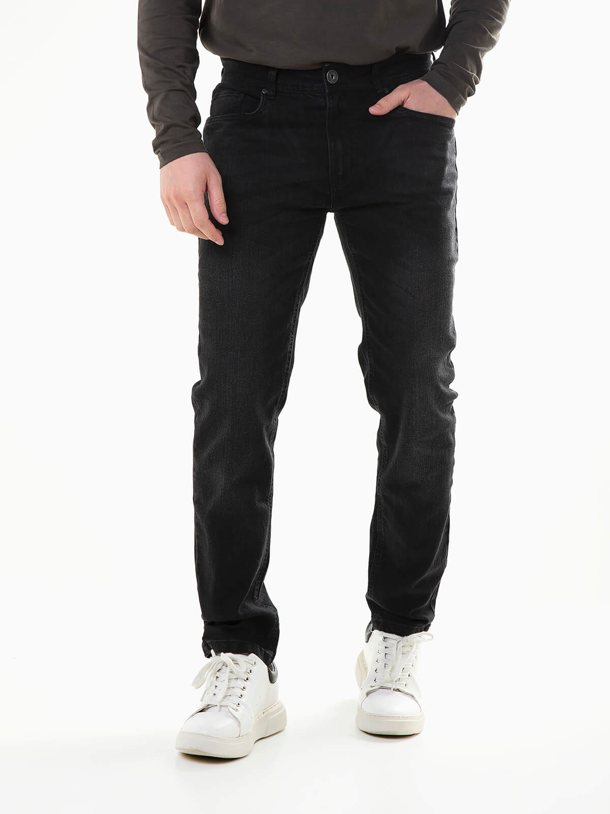 Calças ganga slim fit pretas para homem. Jeans elásticas com 5 bolsos. Aperto fecho éclair e botão.