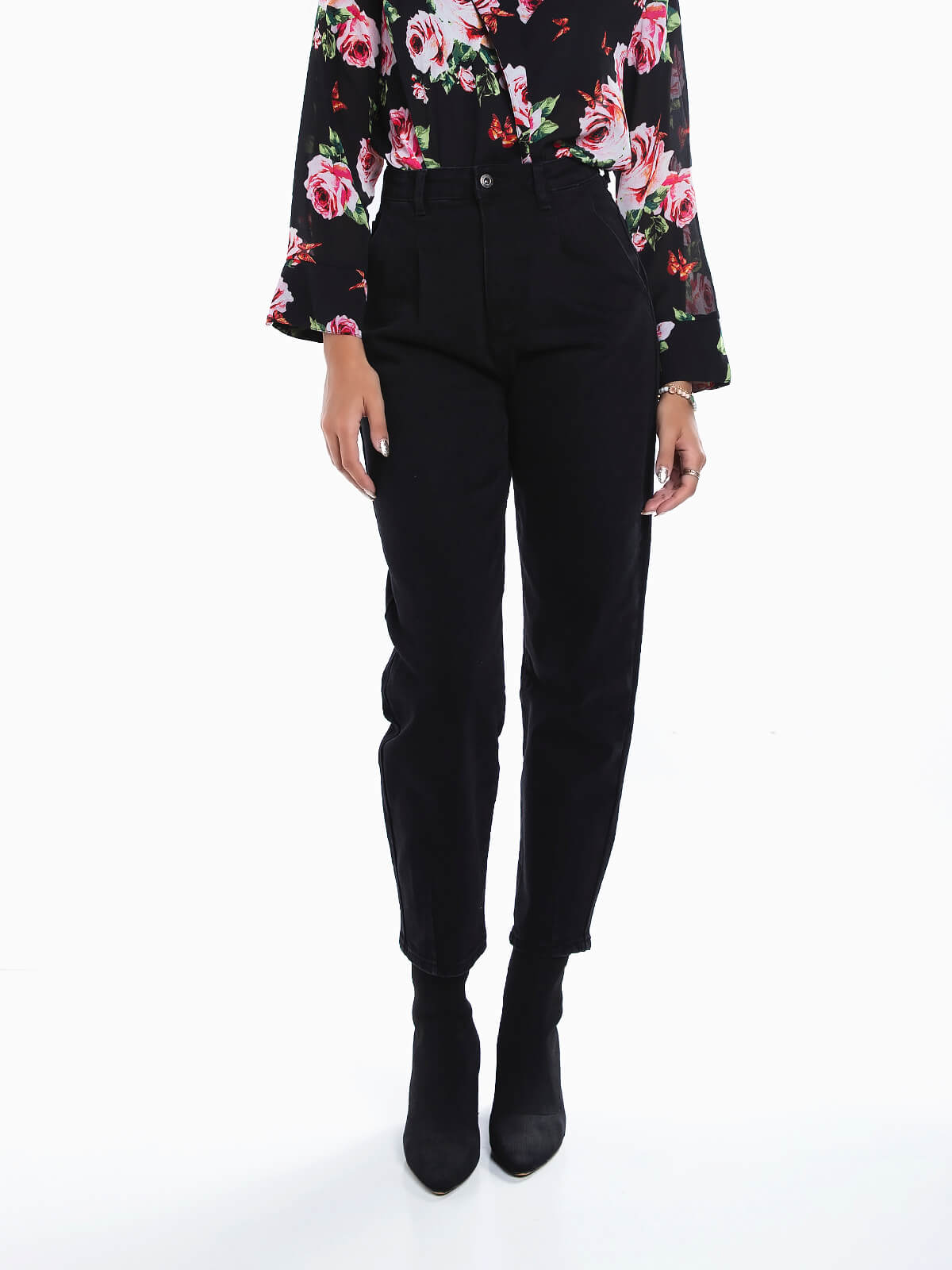 Calças de ganga slouchy pretas para senhora. Jeans de cintura alta. 5 bolsos. Aperto de fecho éclair e botão.
