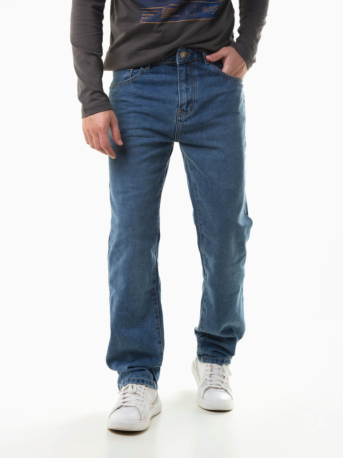 Calças de ganga straight fit para homem com lavagem azul claro. Jeans com 5 bolsos. Aperto fecho éclair e botão.