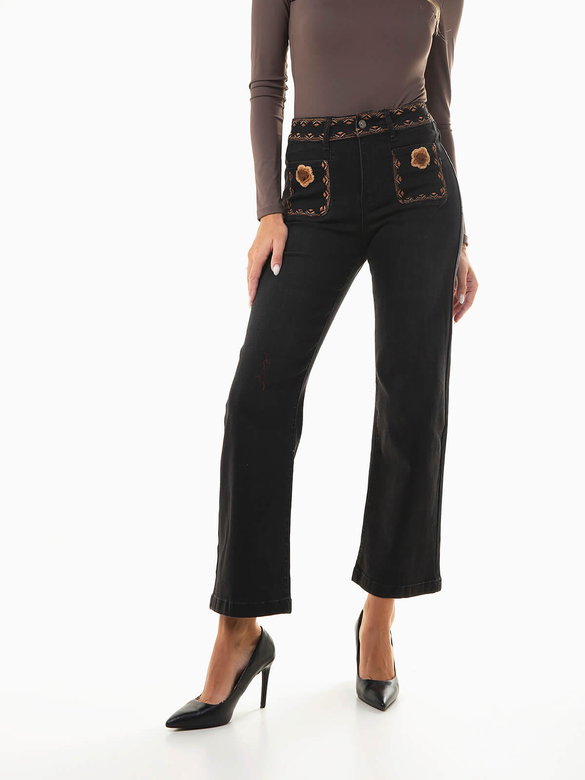 Calças de ganga straight fit de cintura alta, com perna reta e corte intemporal. O detalhe diferenciador está nos bolsos em crochet floral, que acrescentam um toque artesanal e feminino à peça. Modelo de 4 bolsos com fecho éclair e botão, versátil e fácil de coordenar.