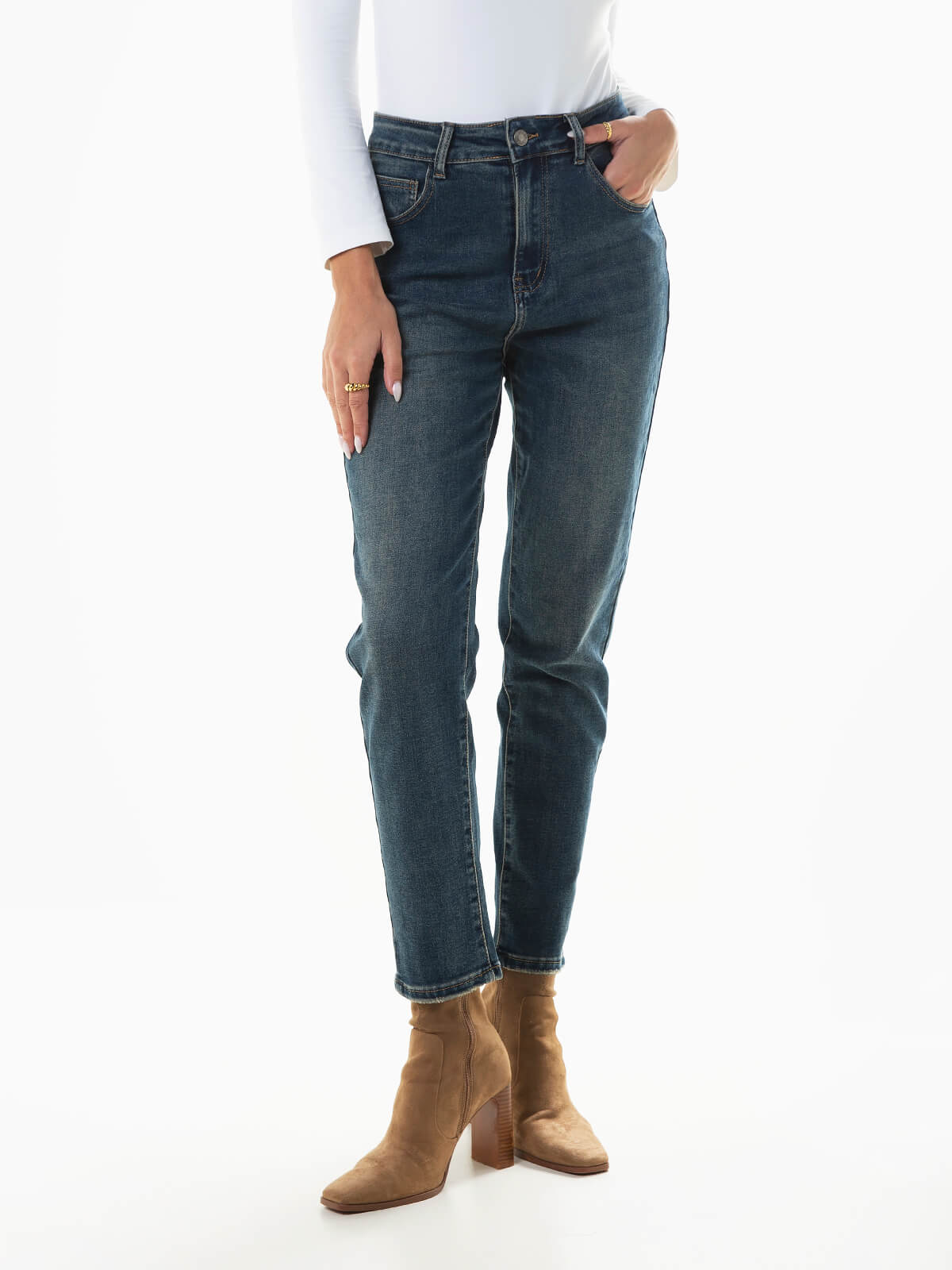 Calças ganga tapered mom fit com lavagem vintage para senhora. Jeans de cintura alta com 5 bolsos. Aperto fecho éclair e botão.