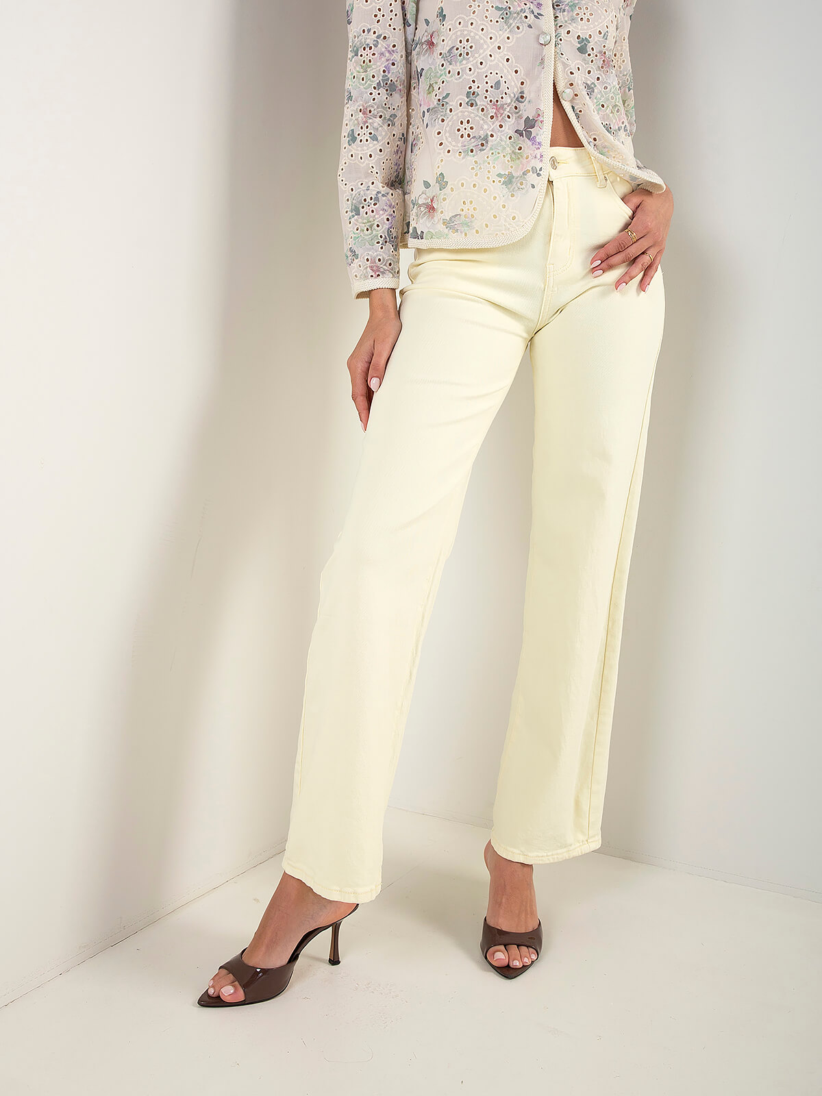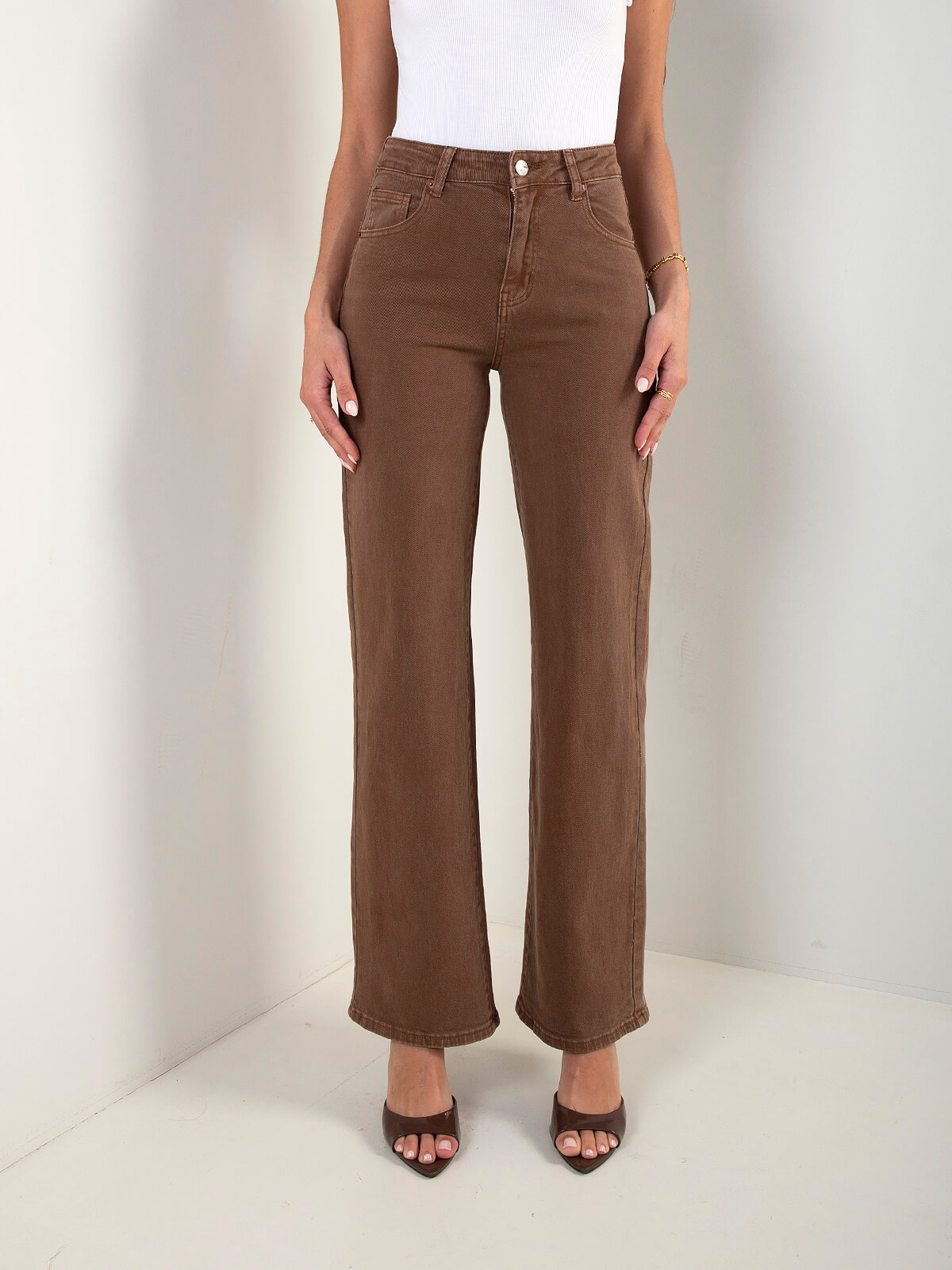 Calças de ganga de cintura alta com corte wide leg. Modelo com cinco bolsos e aperto de fecho éclair e botão. Ajuste confortável com perna larga, ideal para looks modernos e tendência.