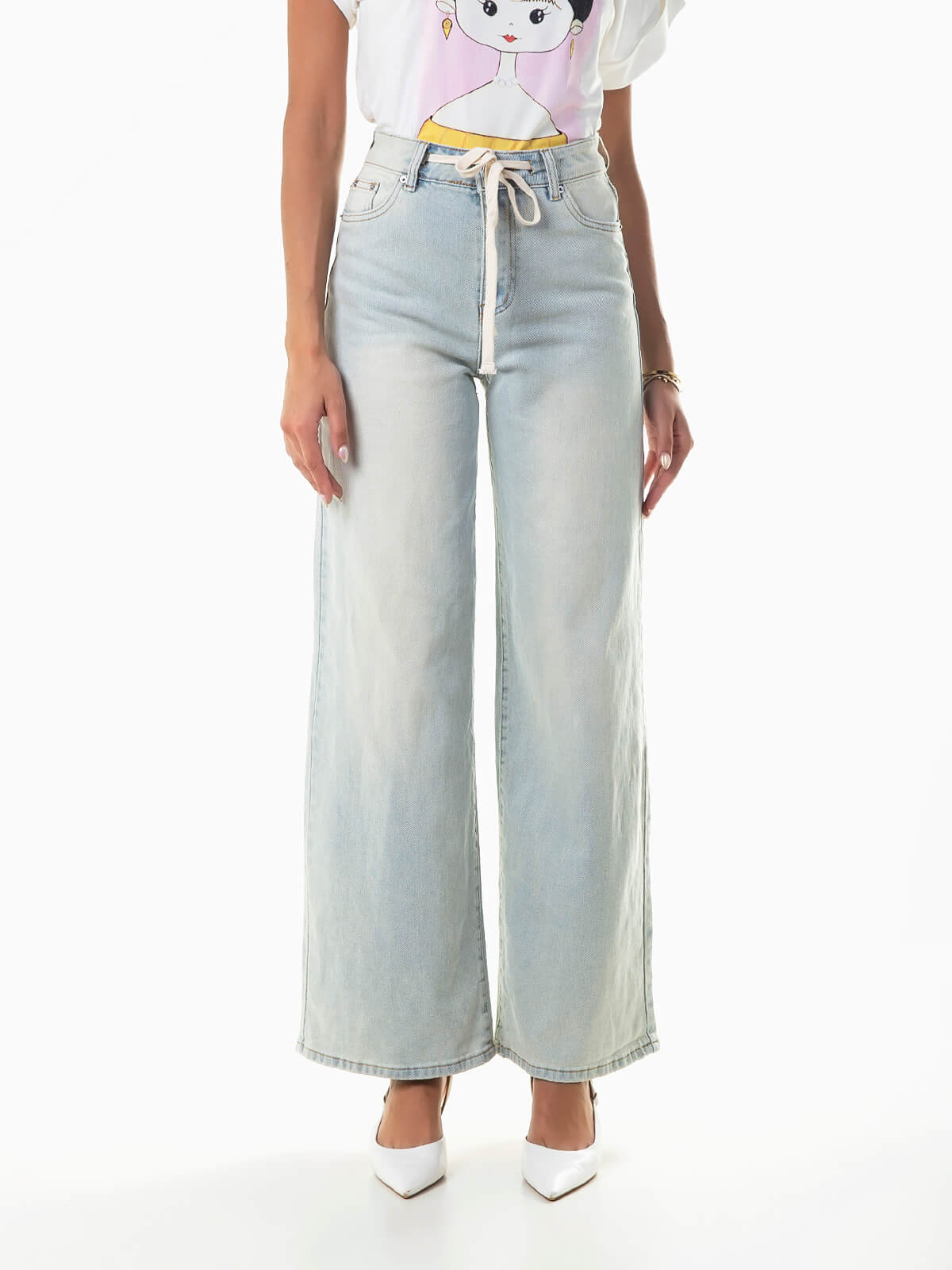 Calças de ganga wide leg com lavagem azul claro vintage. Jeans de cintura alta com cordão para ajustar. 5 bolsos. Aperto de fecho zíper e botão.