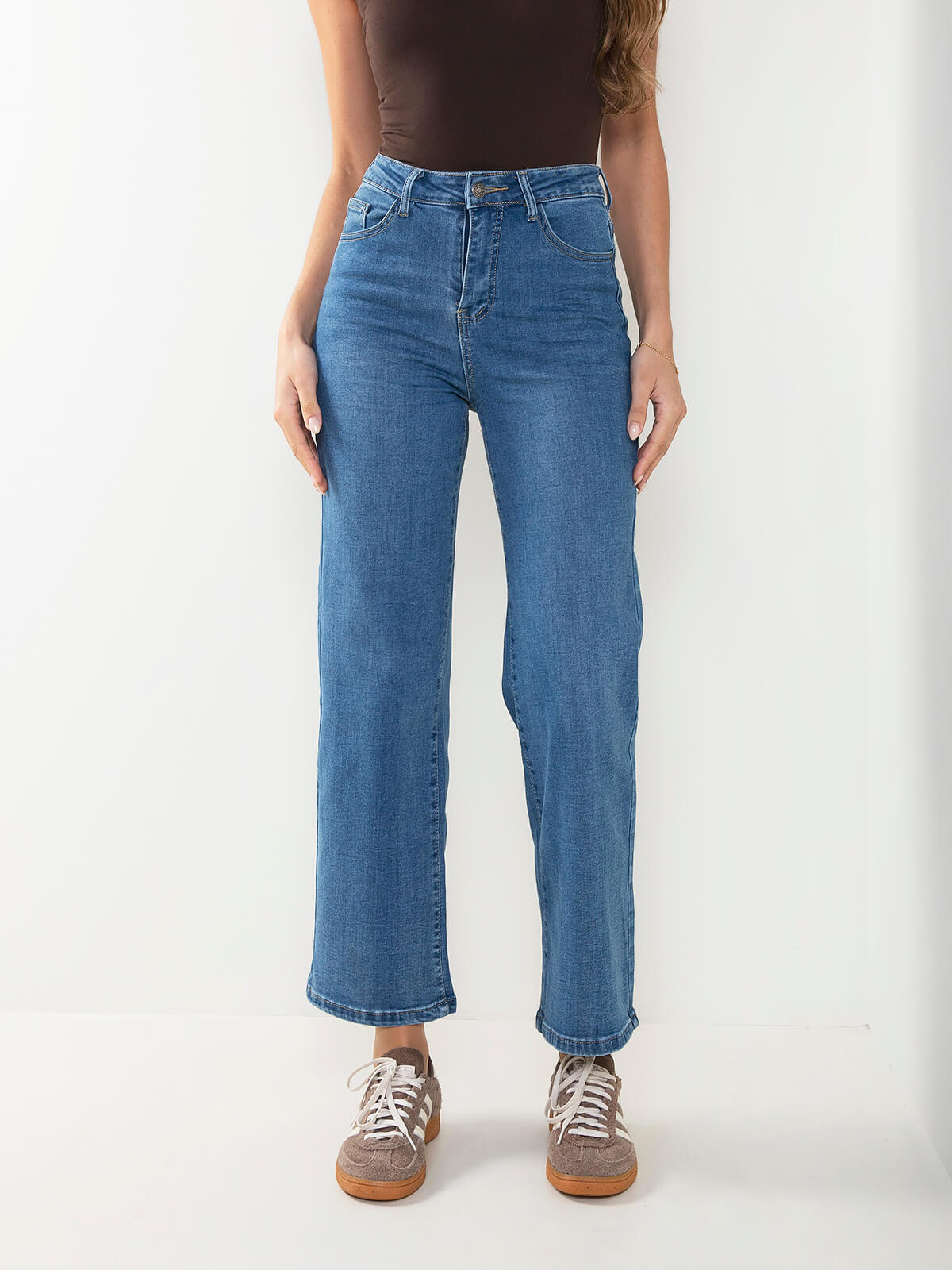 Calças de ganga de cintura alta com corte wide leg. Modelo 5 bolsos, com fecho de correr e botão. Lavagem média versátil, perfeita para looks casuais ou mais arranjados dentro das tendências de moda acessível.