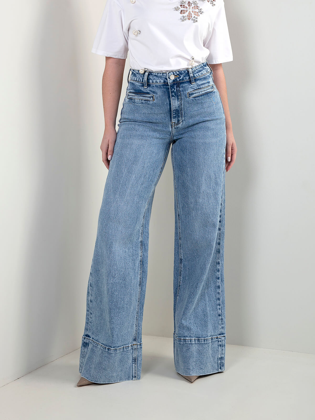 Calças de ganga de cintura alta, com corte wide leg e destaque para a bainha larga, que acrescenta estrutura e um toque atual ao modelo. Um essencial contemporâneo, pensado para looks modernos e versáteis, fácil de adaptar a diferentes estilos e ocasiões.