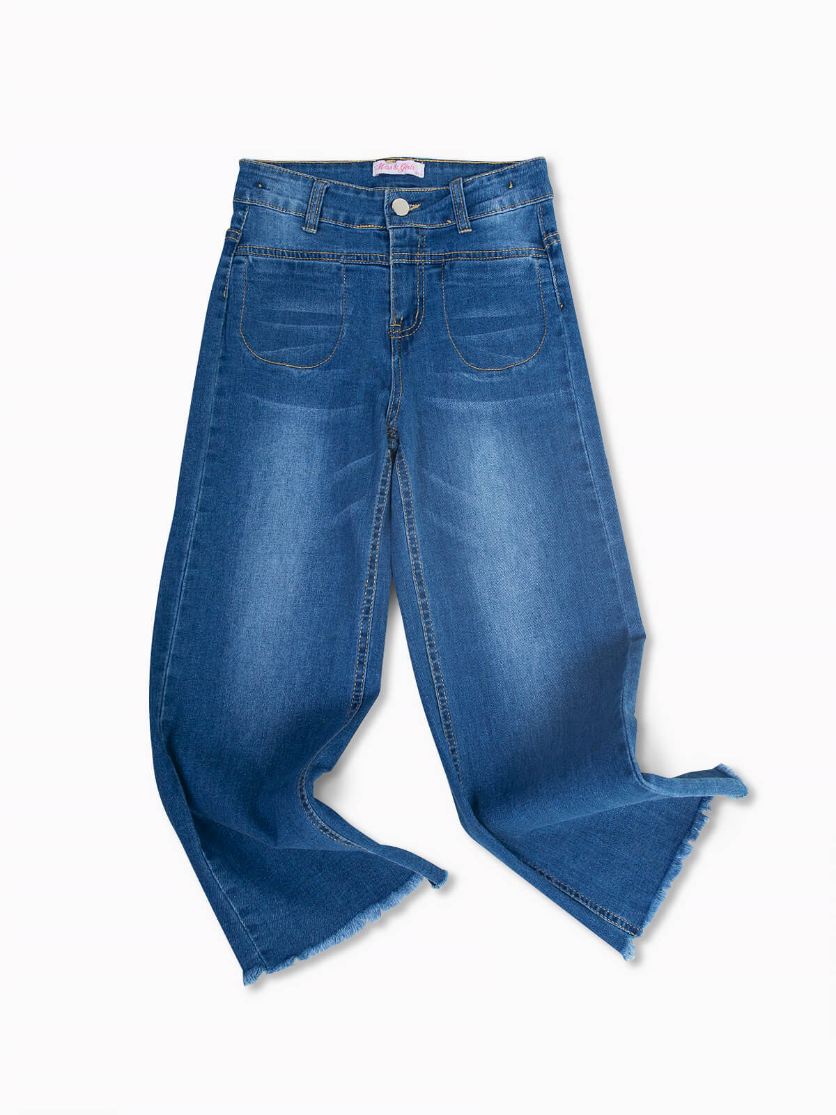 Calças ganga wide leg para menina com base desfiada. Jeans elásticas de lavagem azul claro com ajustador no interior. 4 bolsos. Aperto fecho zíper e botão.