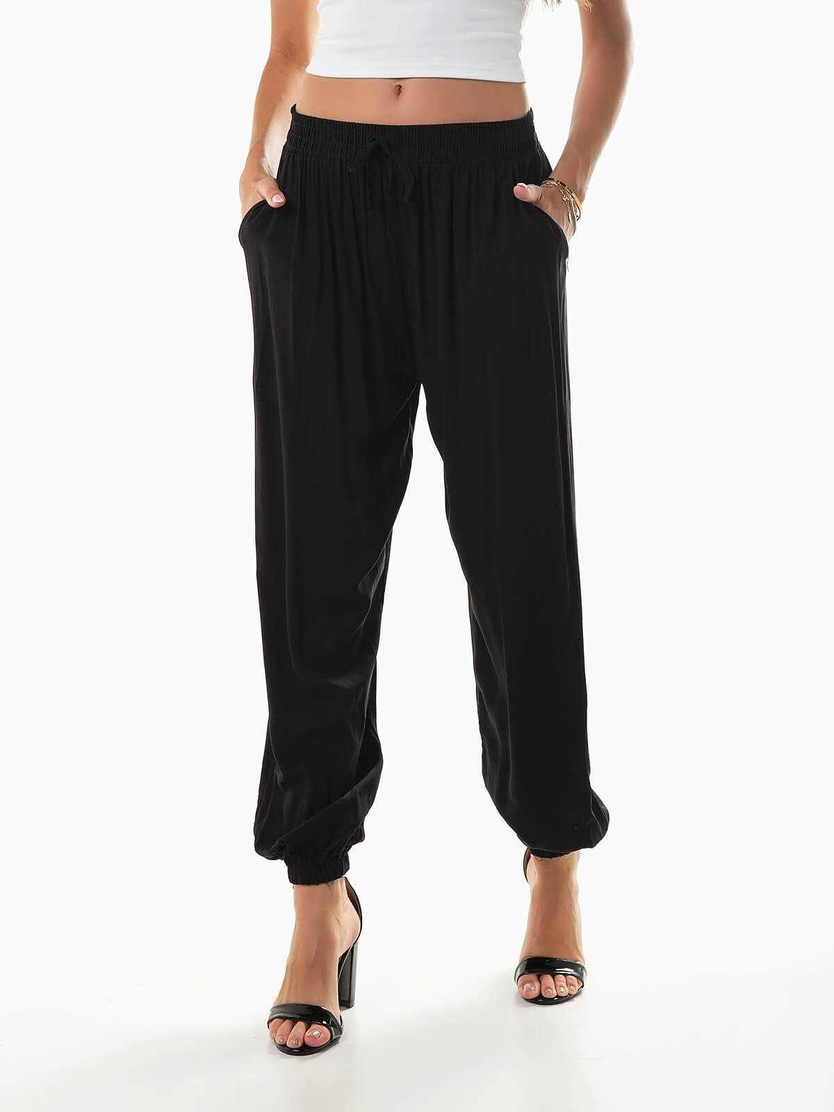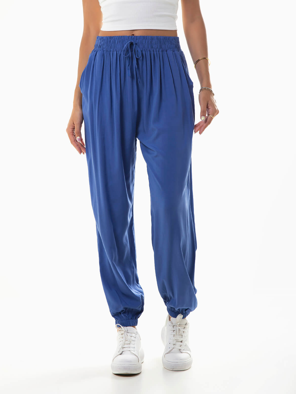 Calças jogger confecionadas em tecido mistura de algodão, frescas e confortáveis. Calças fluídas de cintura alta com cordão para laço. 2 bolsos.
