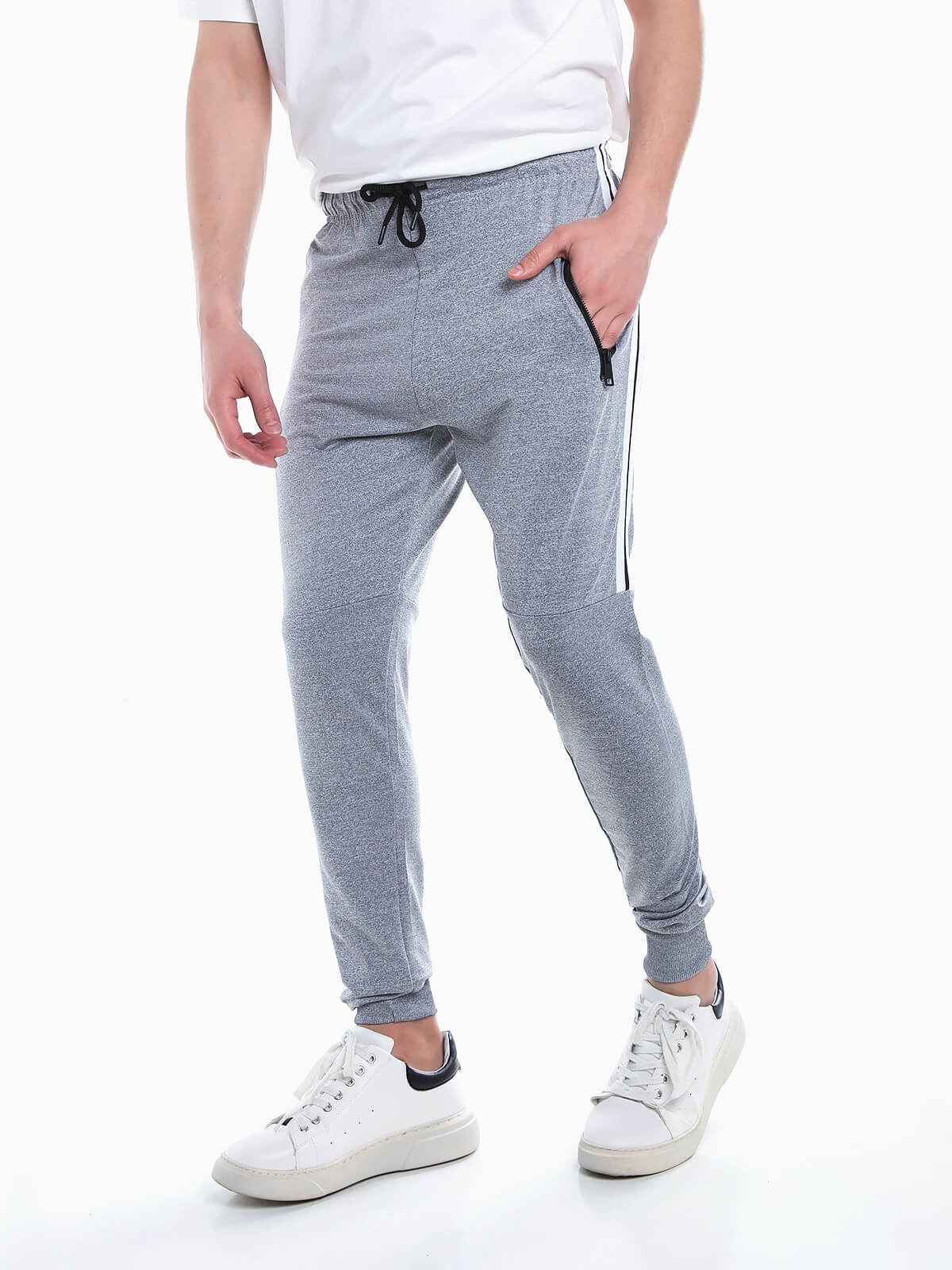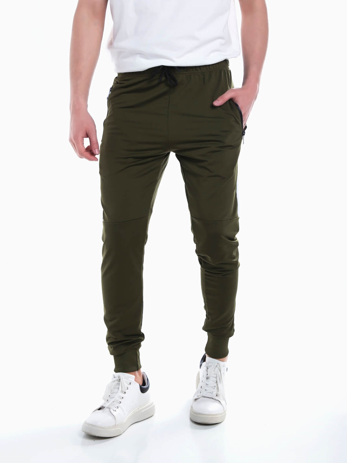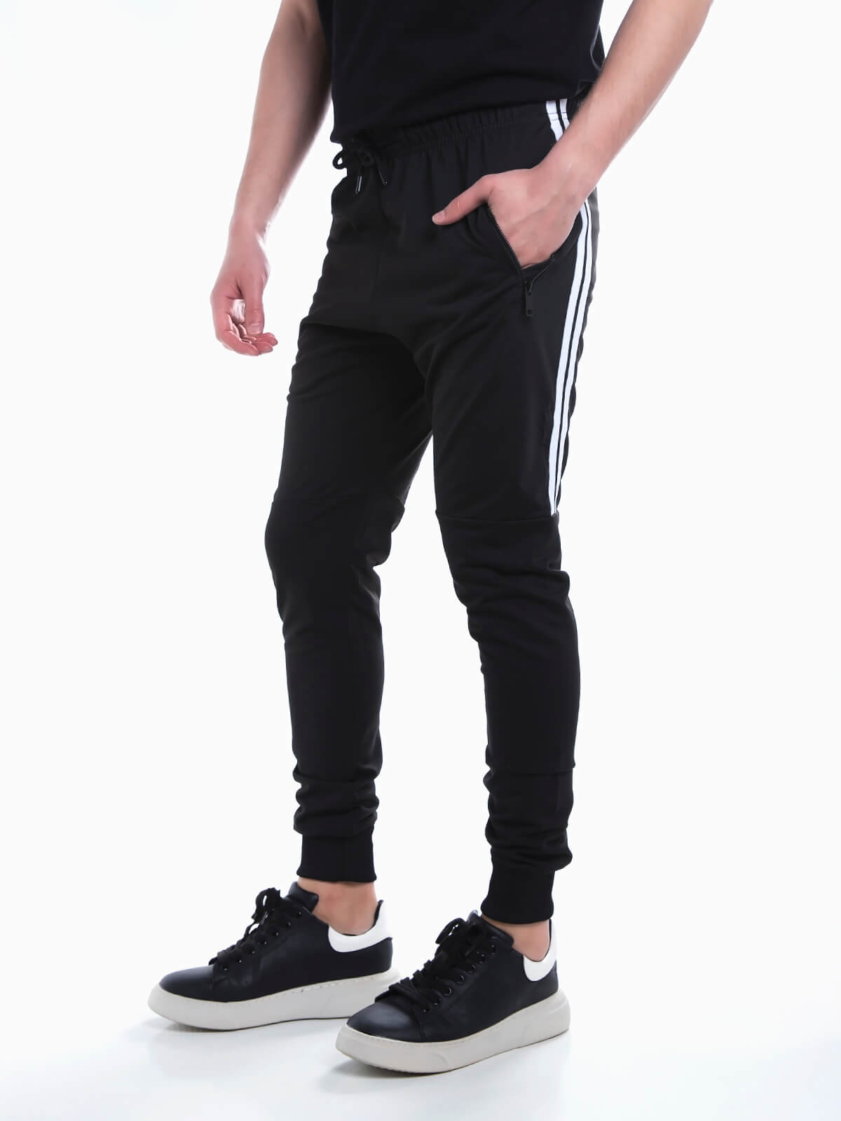 Calças jogger com banda de cor para homem. Calças desportivas com cintura e punhos elásticos. Cordão para ajustar. 2 bolsos.