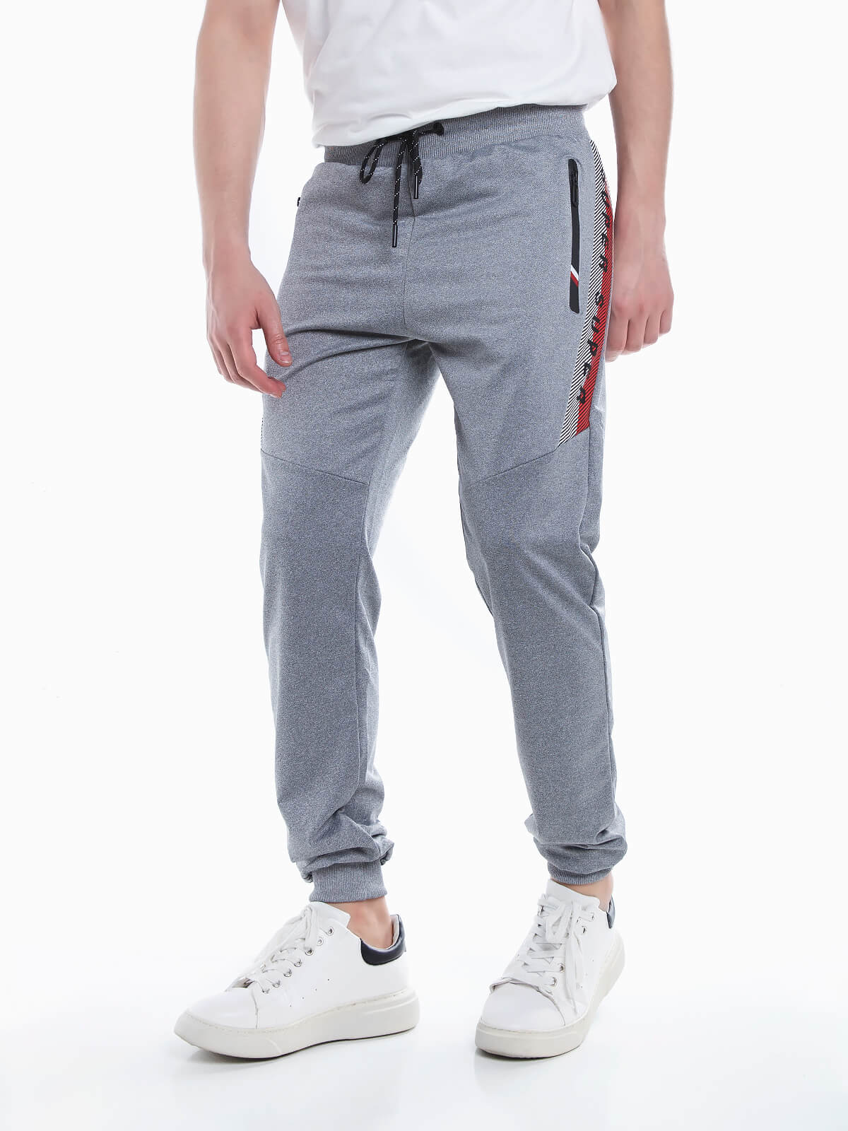 Calças jogger com banda lateral com estampado de letras. Calças desportivas em tecido neopreno com cintura e punhos elásticos. Cordão para ajustar. 3 bolsos.