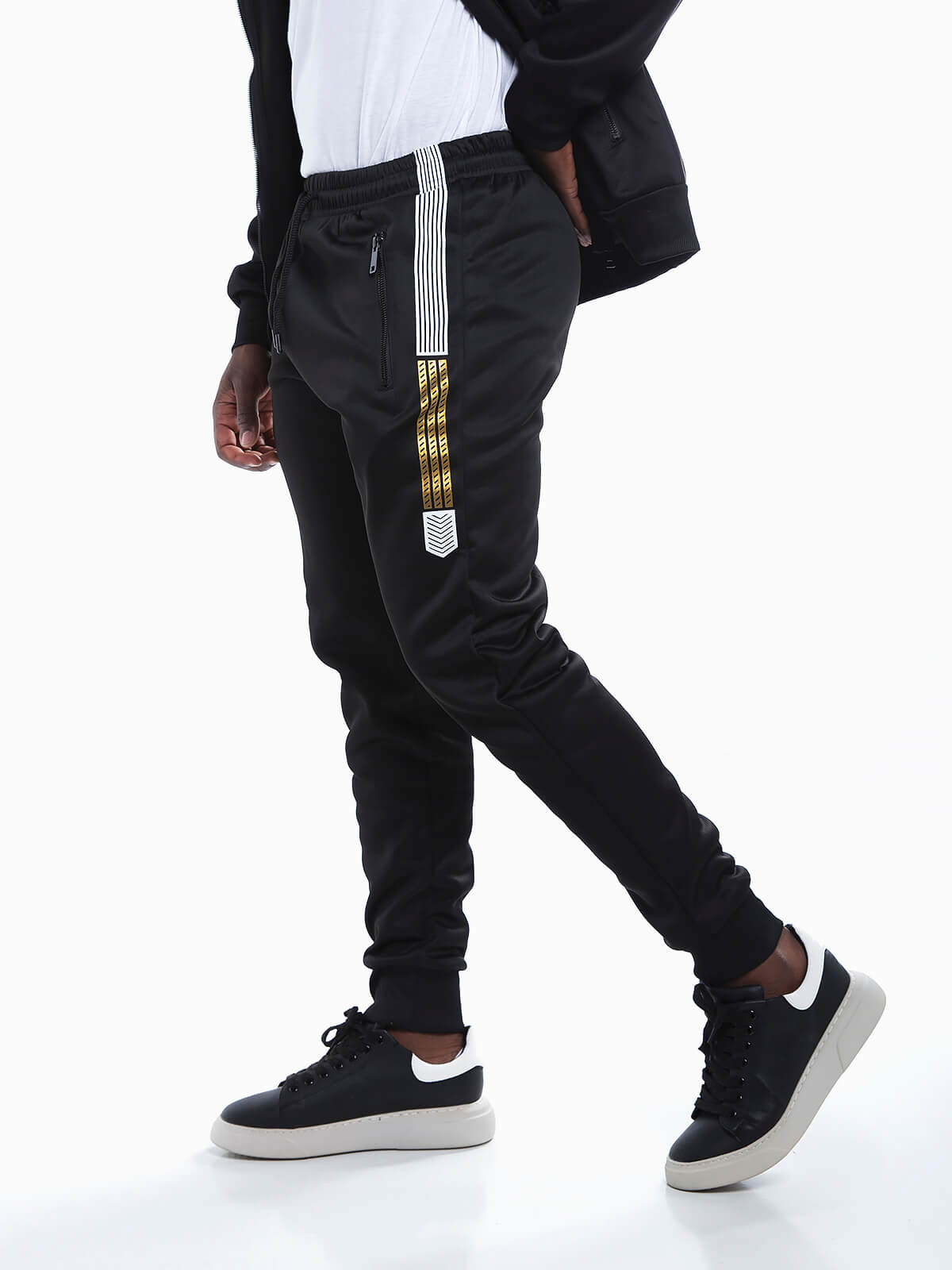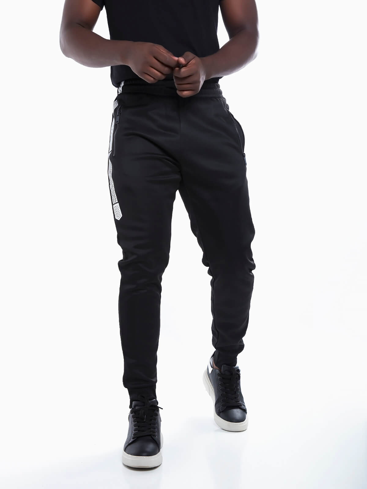Calças jogger com bandas estampadas nas laterais. Joggers elásticas com cordão na cintura para ajustar. 2 bolsos com zíper. Punhos elásticos.