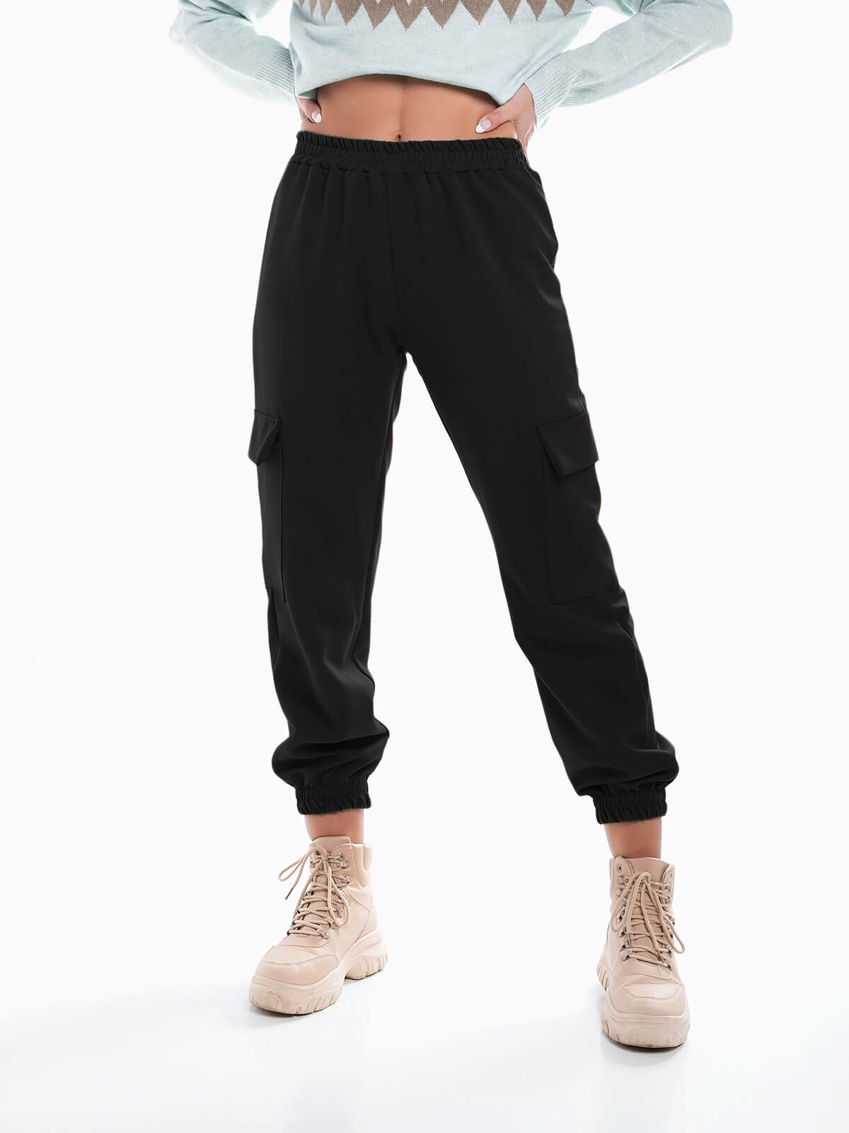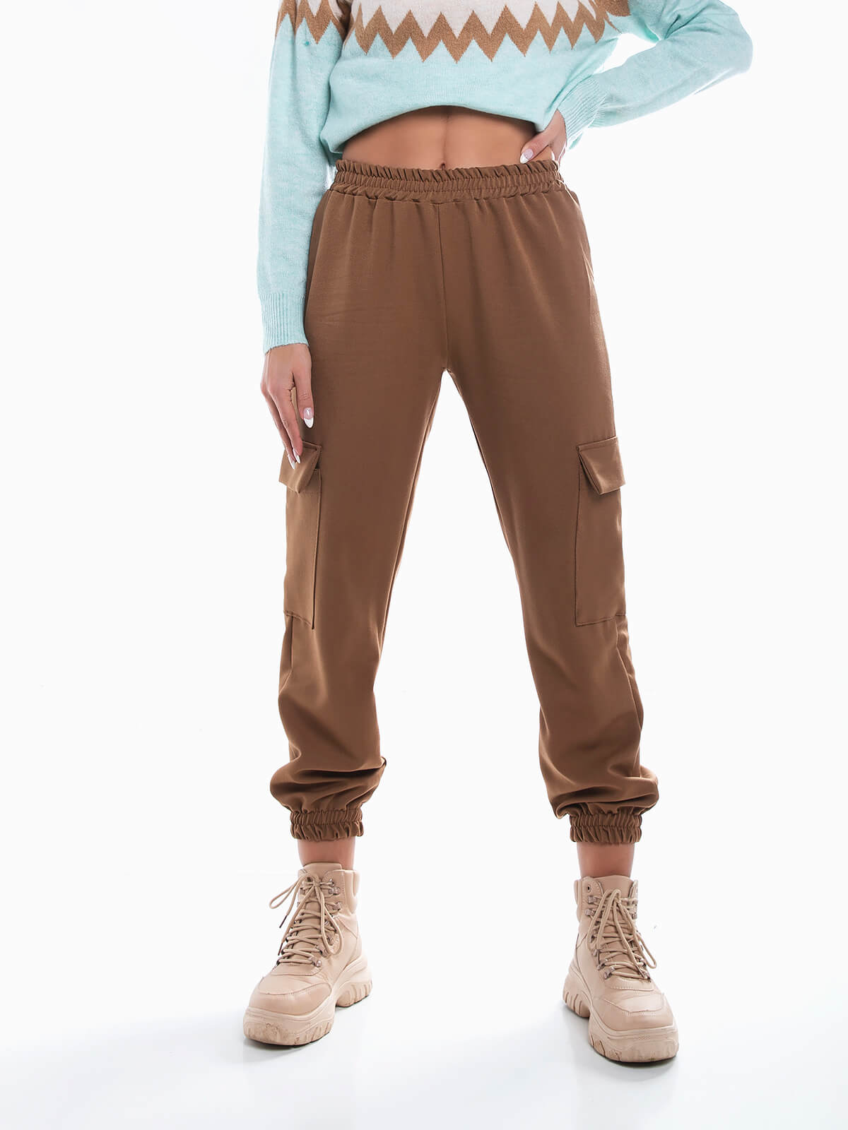 Calças jogger cargo de cintura alta para senhora. Calças com cintura e punhos elásticos. 2 bolsos quadrados.