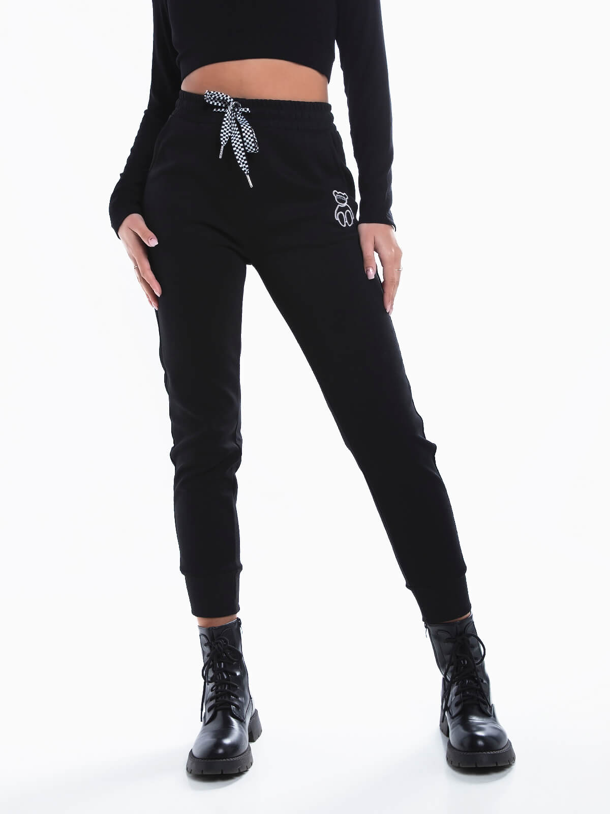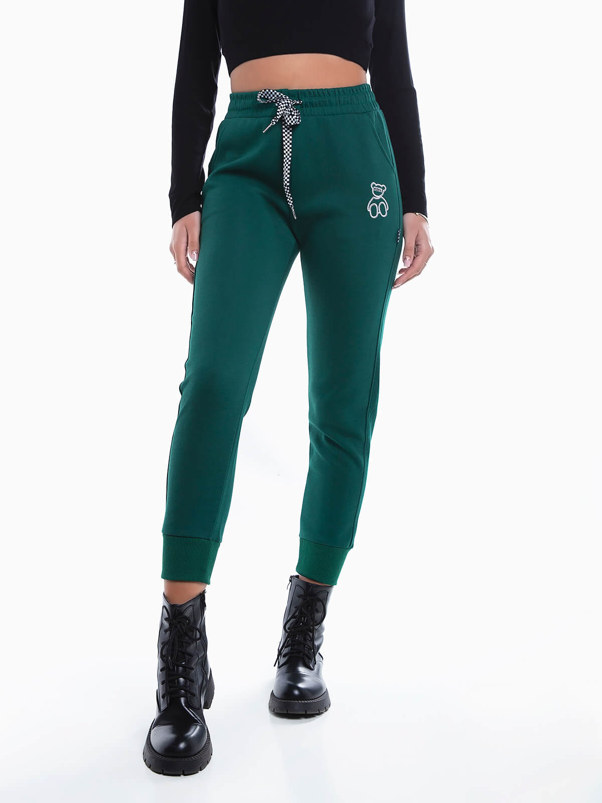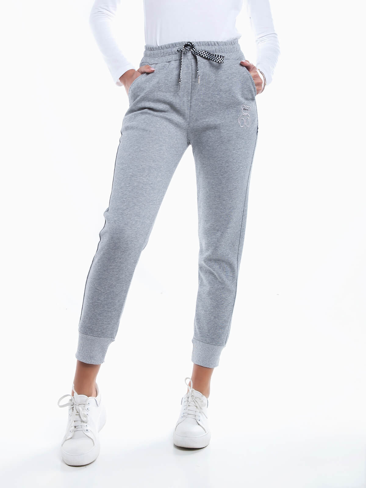 Calças jogger com urso bordado para senhora. Calças desportivas com cintura e punhos elásticos. Cordão na cintura para ajustar. 2 bolsos.