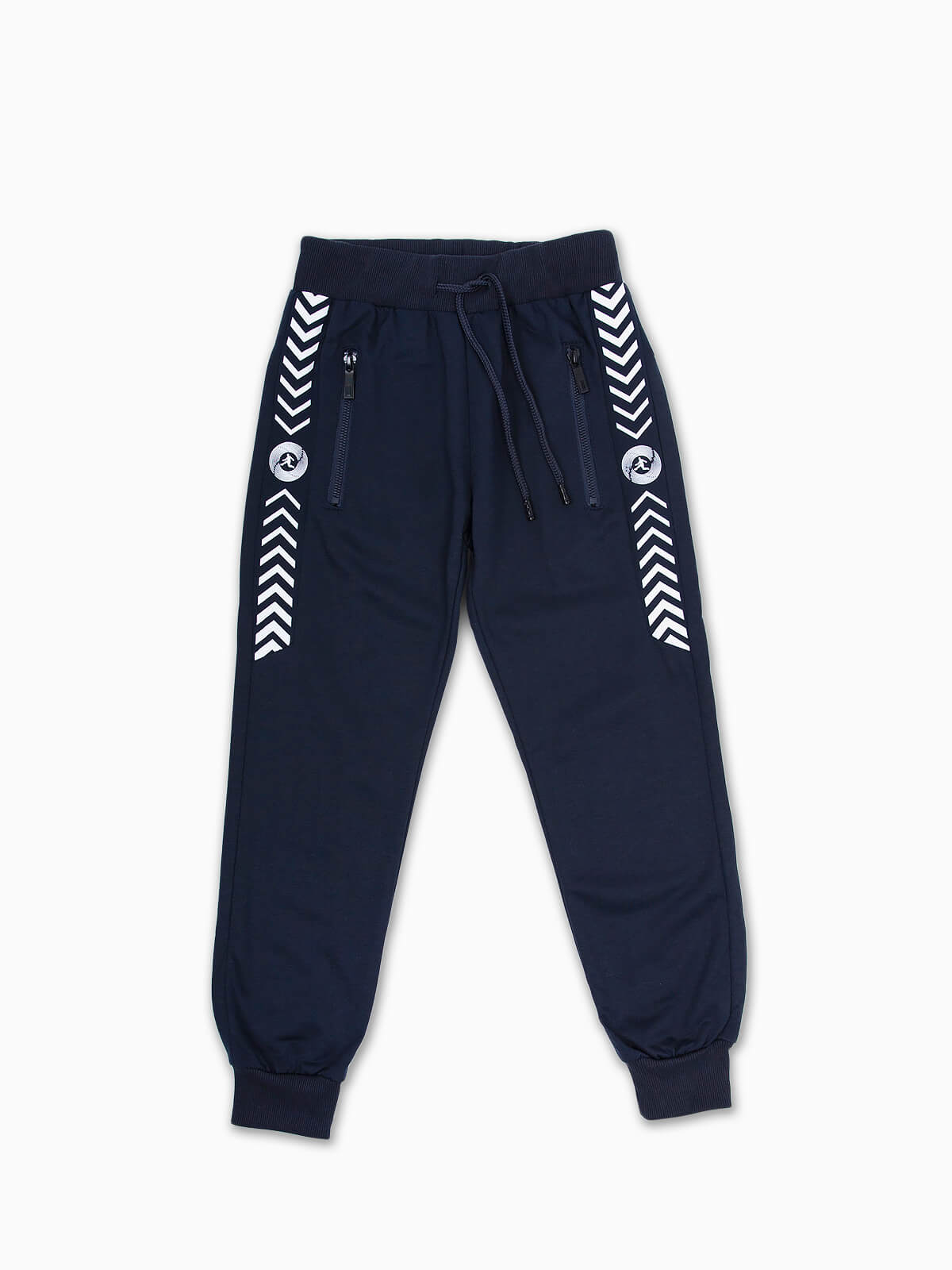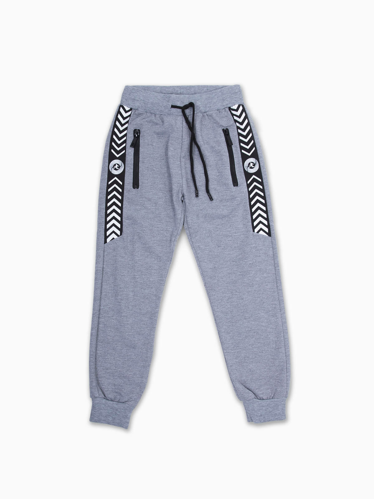 Calças jogger com estampado geométrico nas laterais. Calças desportivas com 2 bolsos zíper. Punhos elásticos. Cintura com cordão para ajustar.