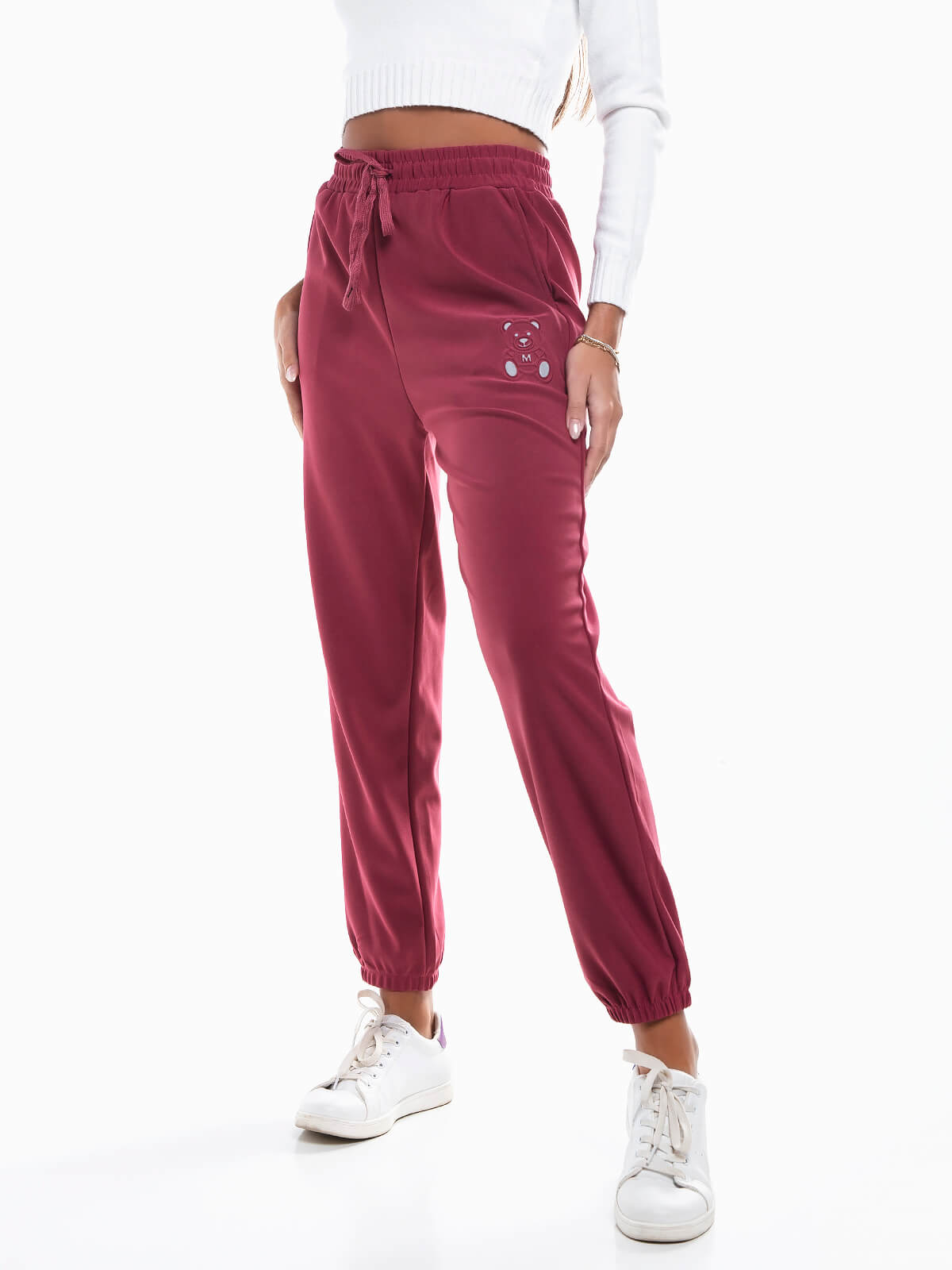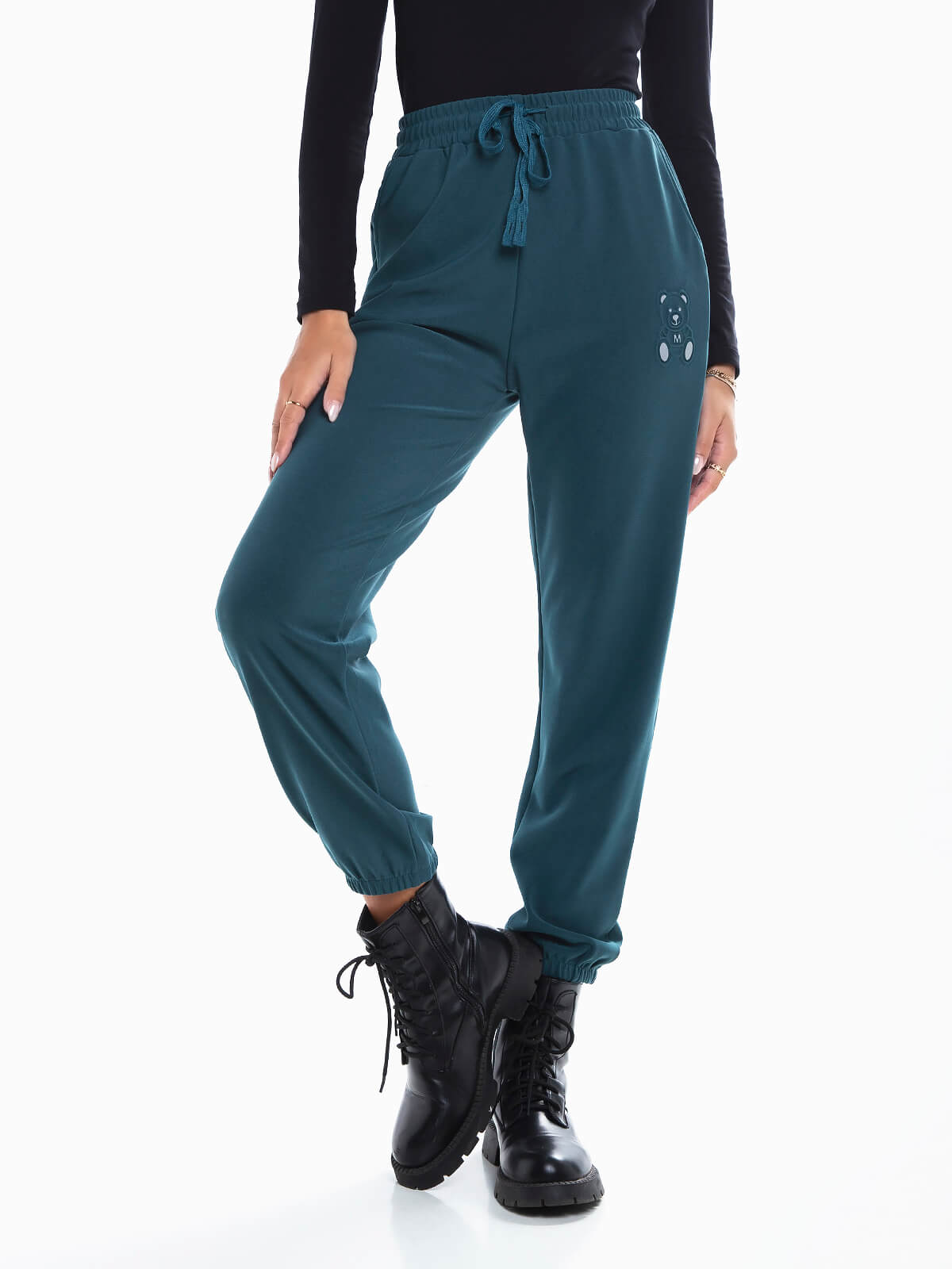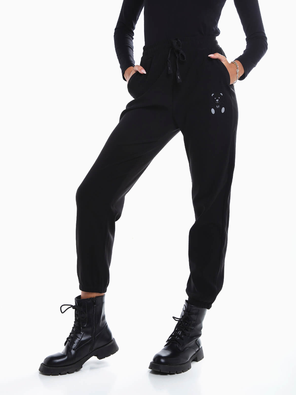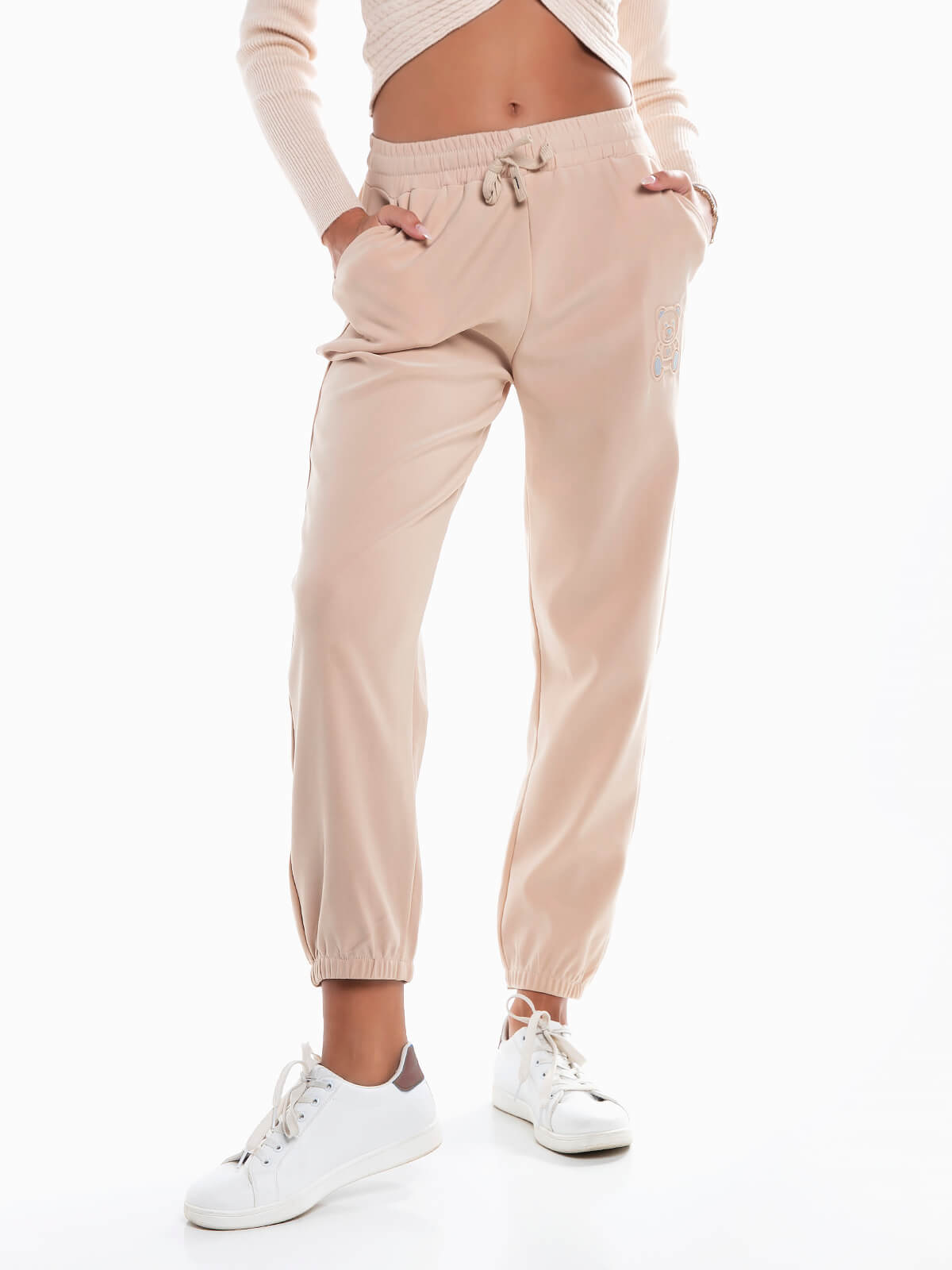 Calças jogger com urso em relevo. Calças desportivas de cintura alta elástica com cordão para ajustar. 2 bolsos.