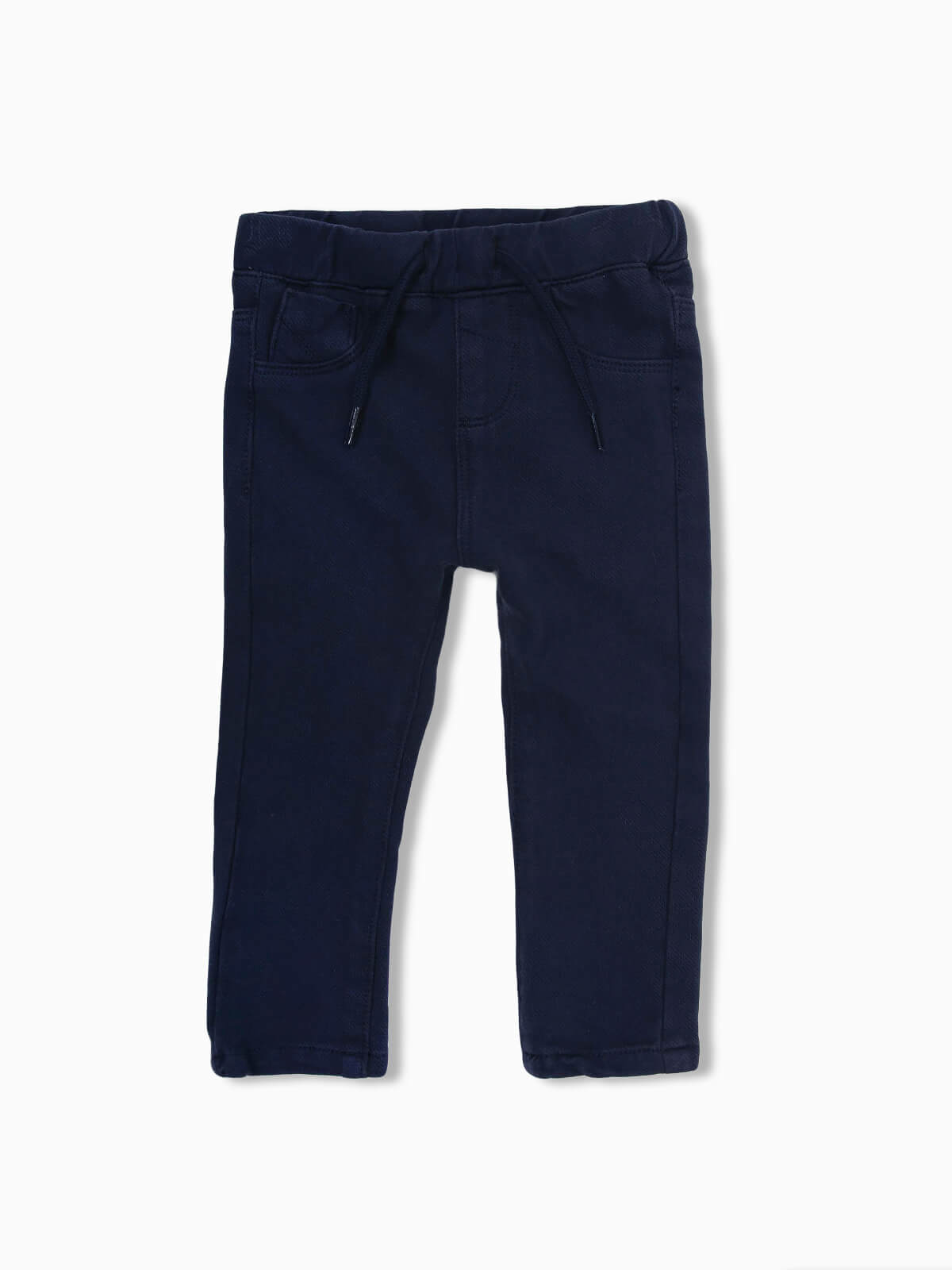 Calças jogger elásticas com 2 bolsos na parte posterior. Calças em malha para bebé menino com cordão para laço. Ajustador no interior.