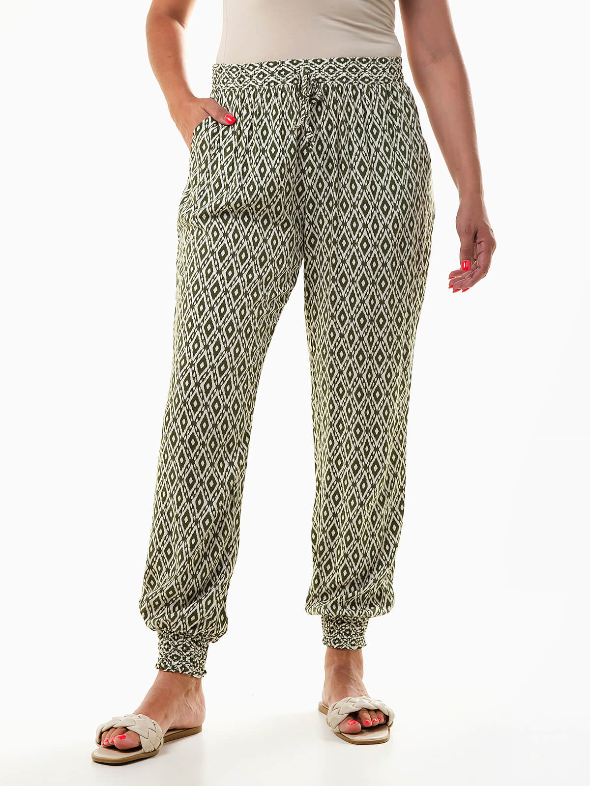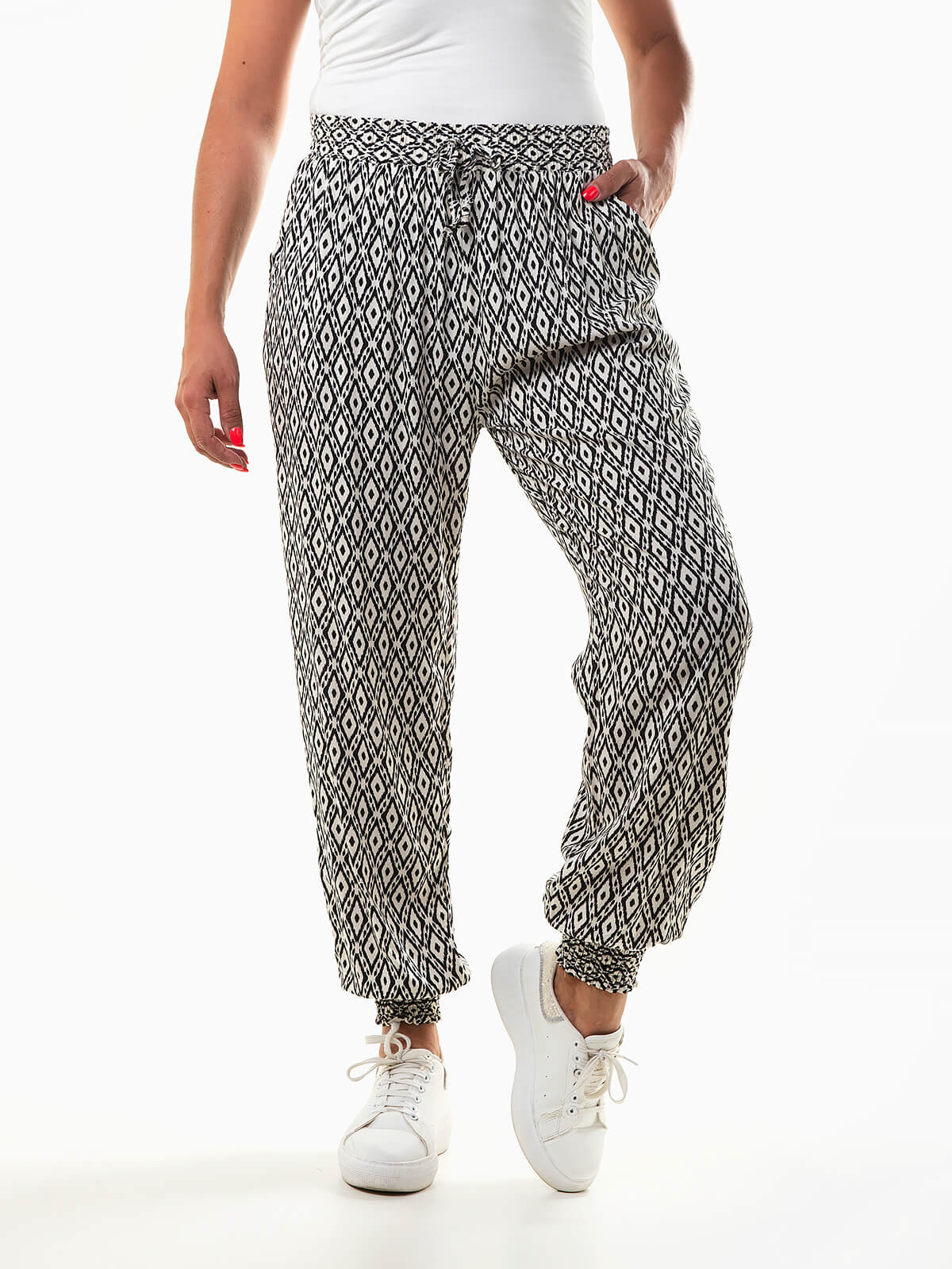 Calças jogger frescas e confortáveis com estampado geométrico. Calças fluídas étnicas para senhora com cintura alta e punhos elásticos. Cordão para laço. 2 bolsos.