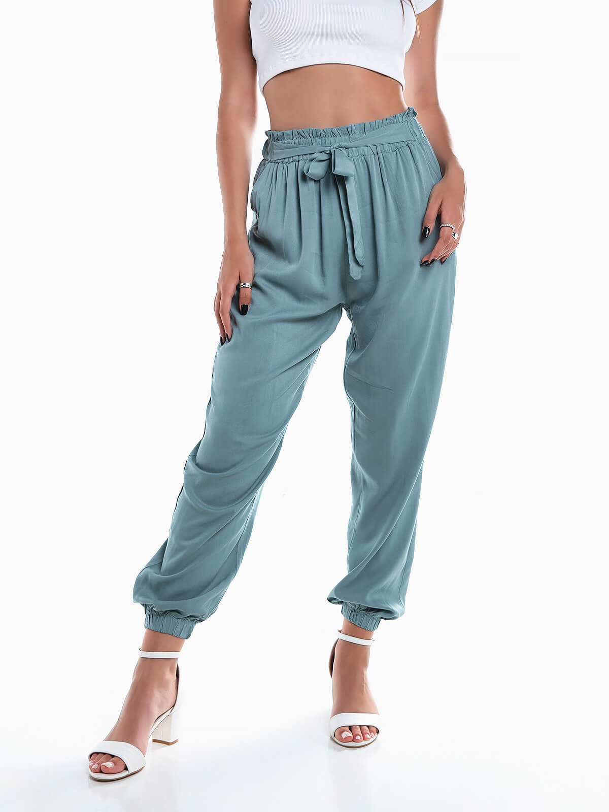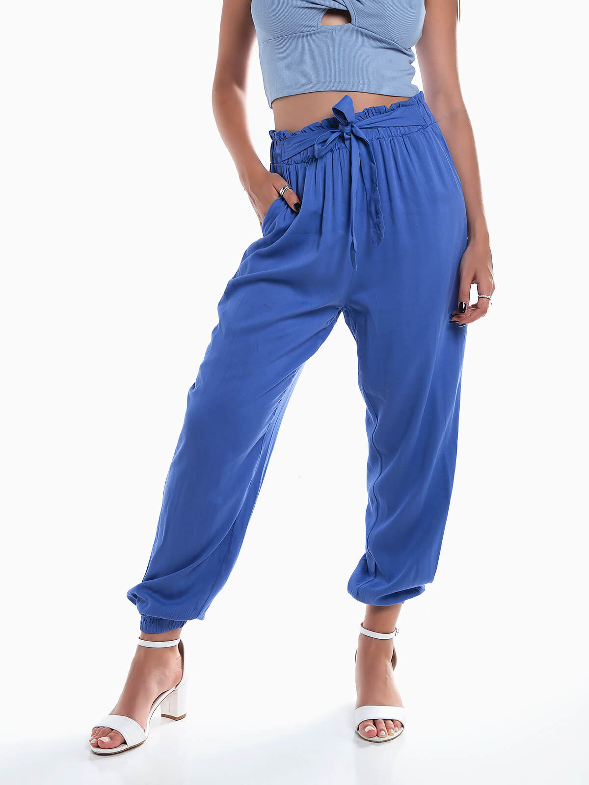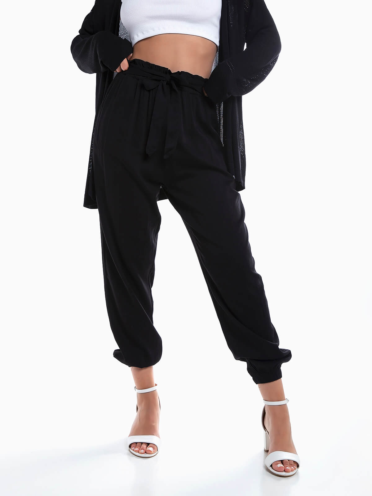 Calças jogger fluídas com aperto de laço. Calças cintura alta em tecido 100% algodão com punhos elásticos.