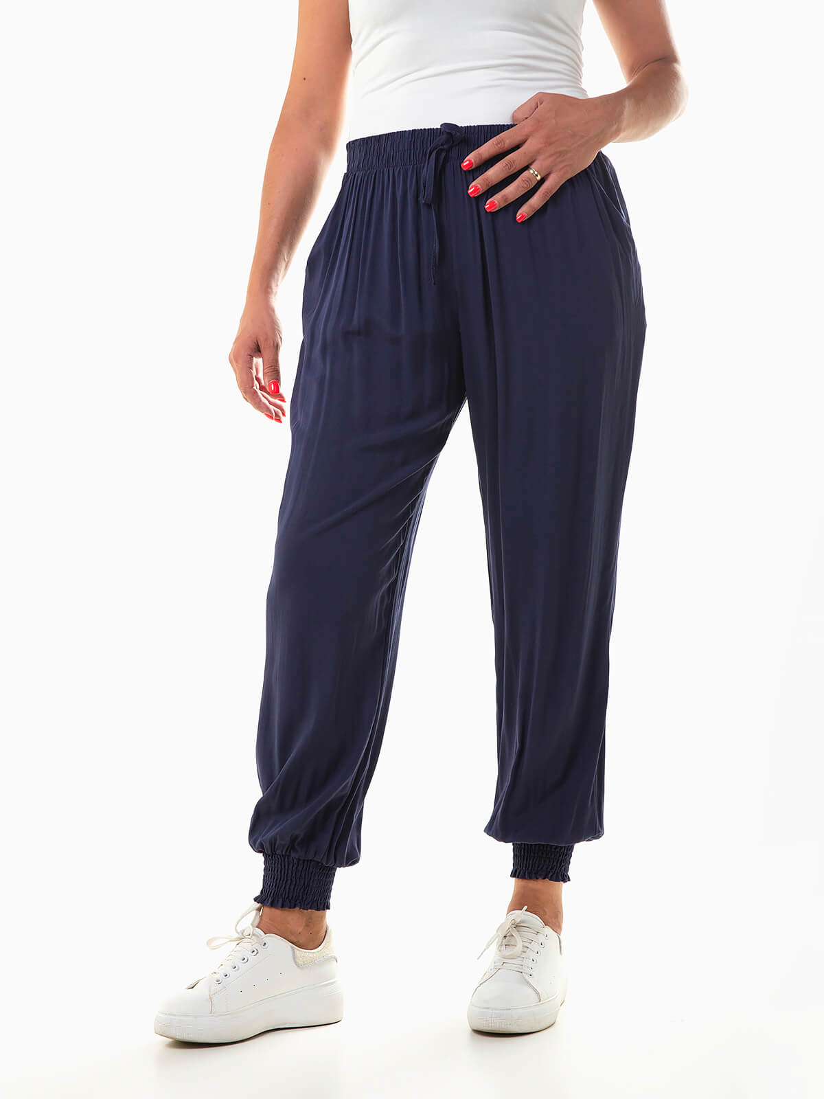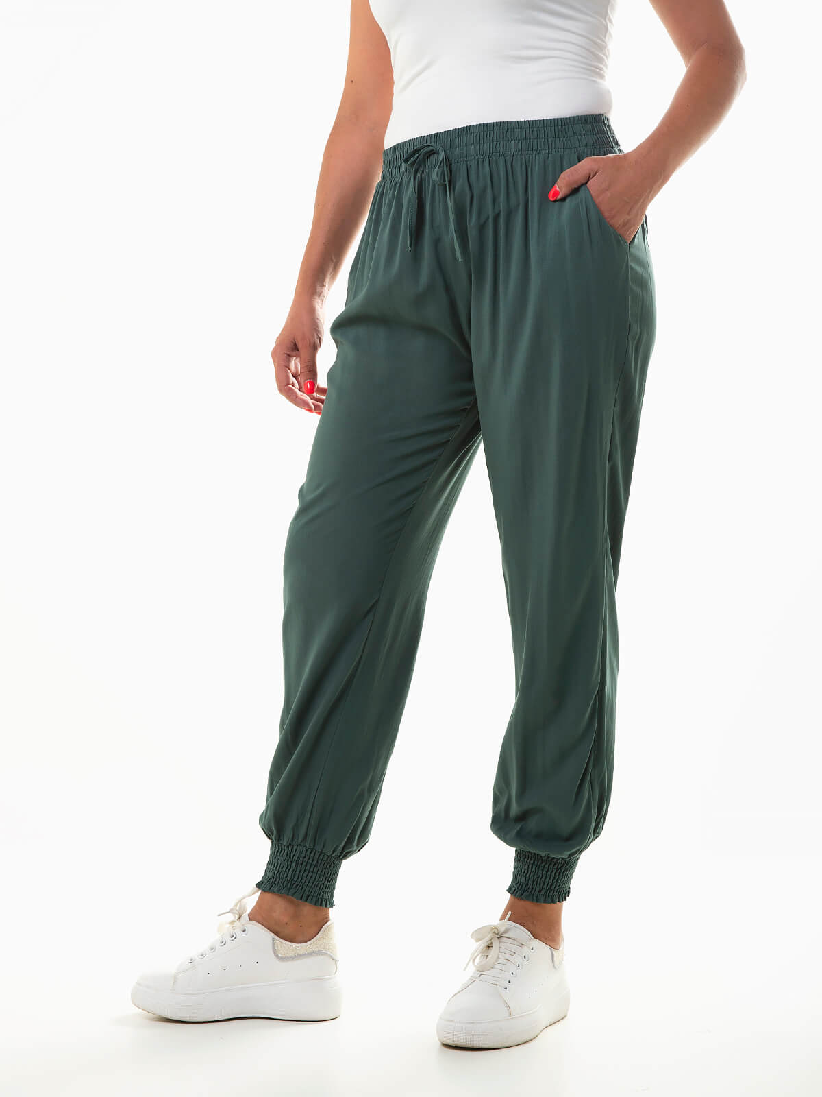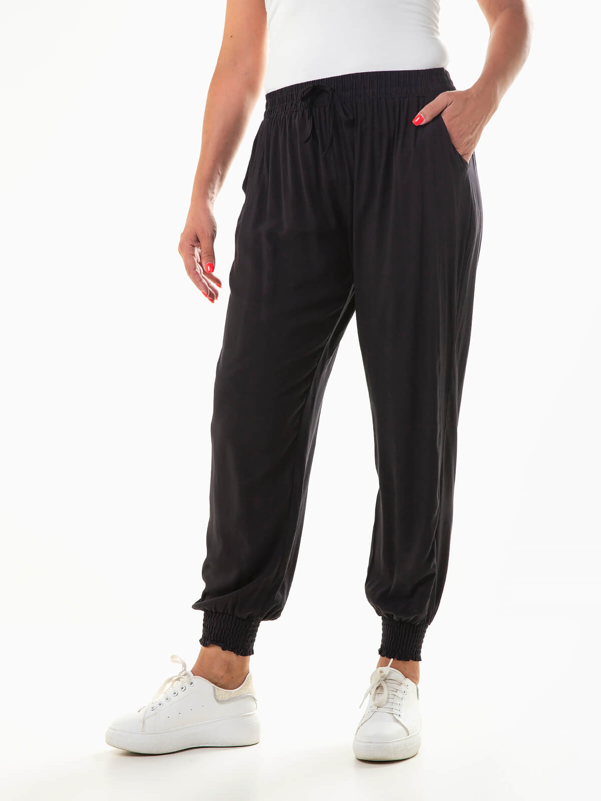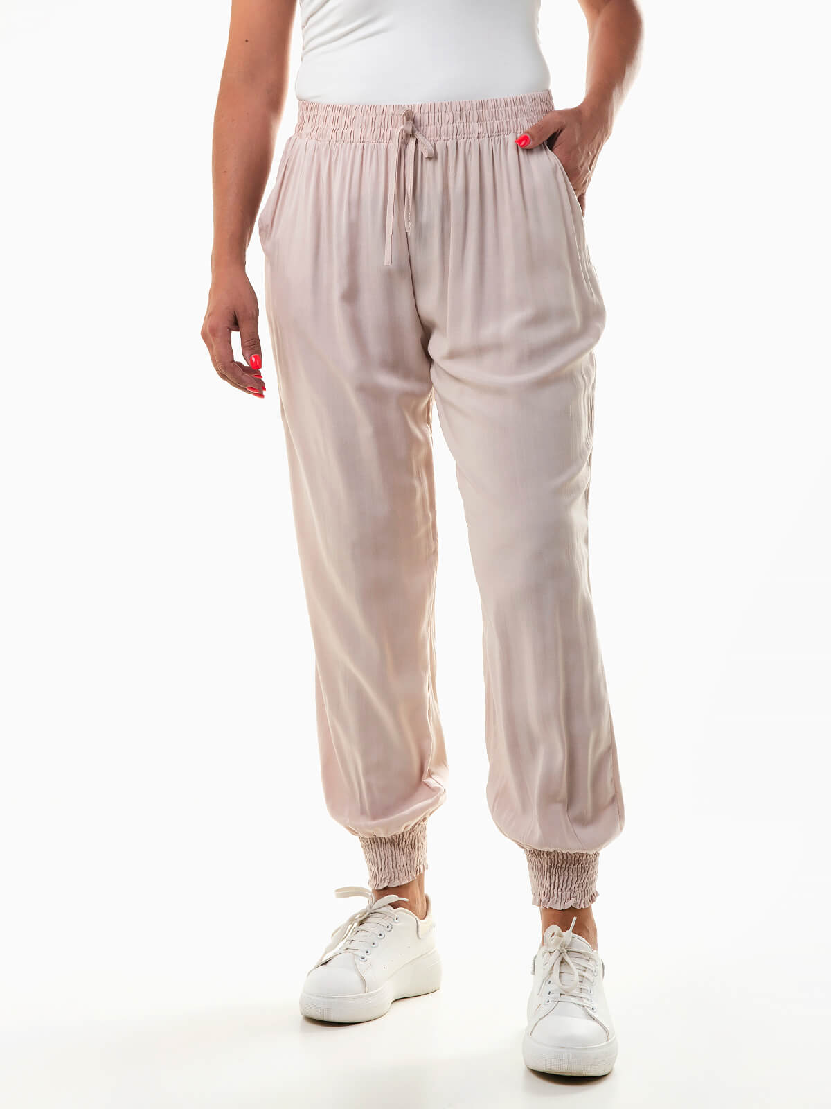 Calças jogger confecionadas em tecido mistura de algodão, frescas e confortáveis. Calças fluídas com cintura alta e punhos elásticos. Cordão para laço. 2 bolsos.