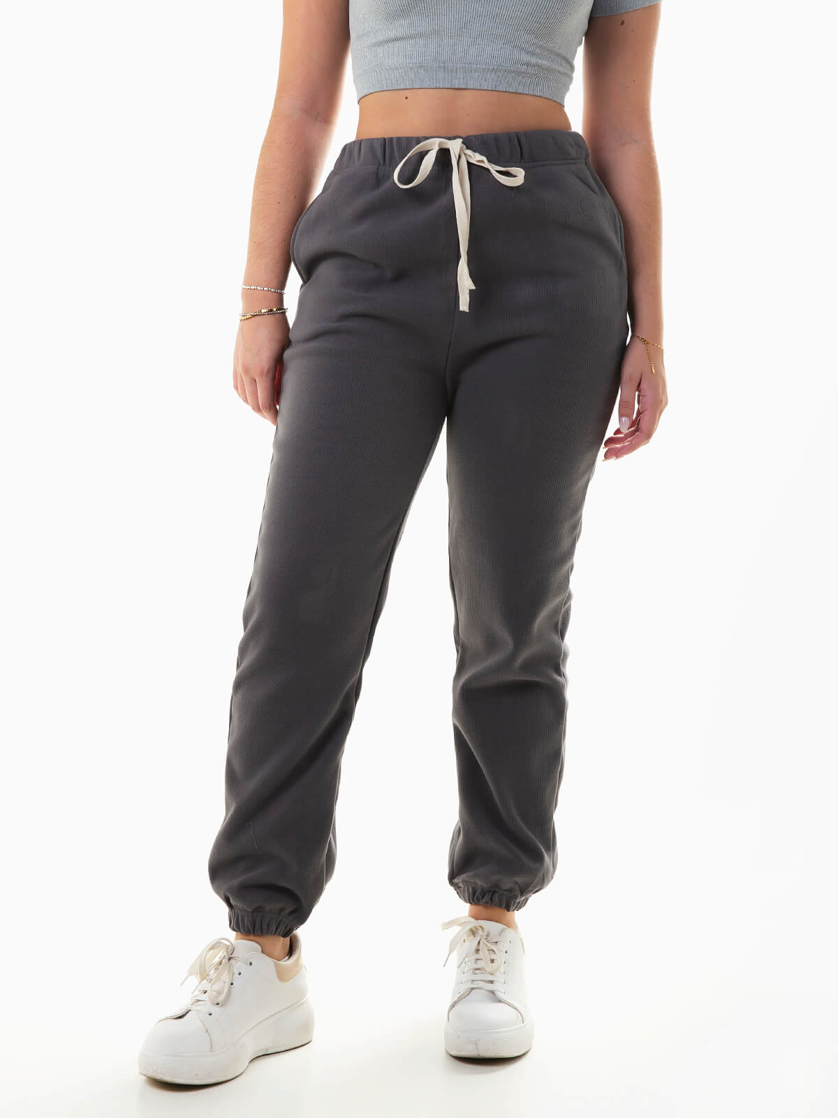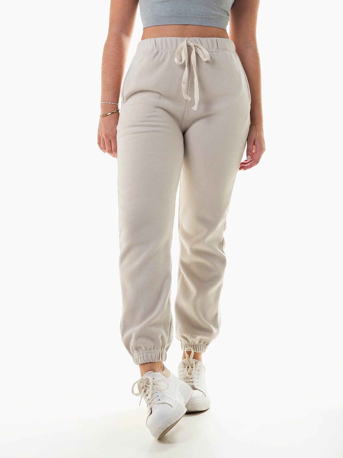 Calças jogger em malha canelada com interior polar. Calças para senhora com cintura alta elástica e cordão para laço. 2 bolsos.