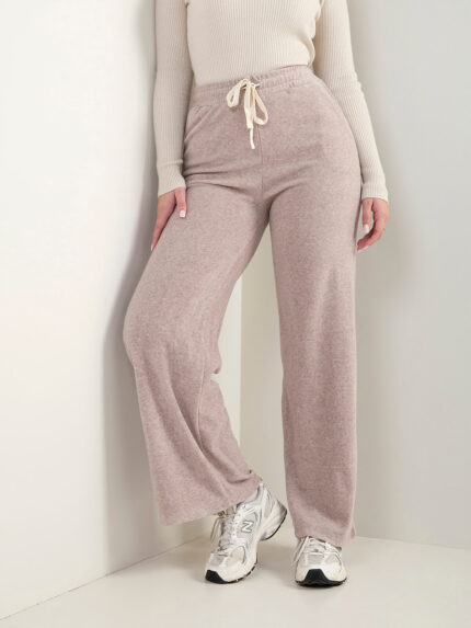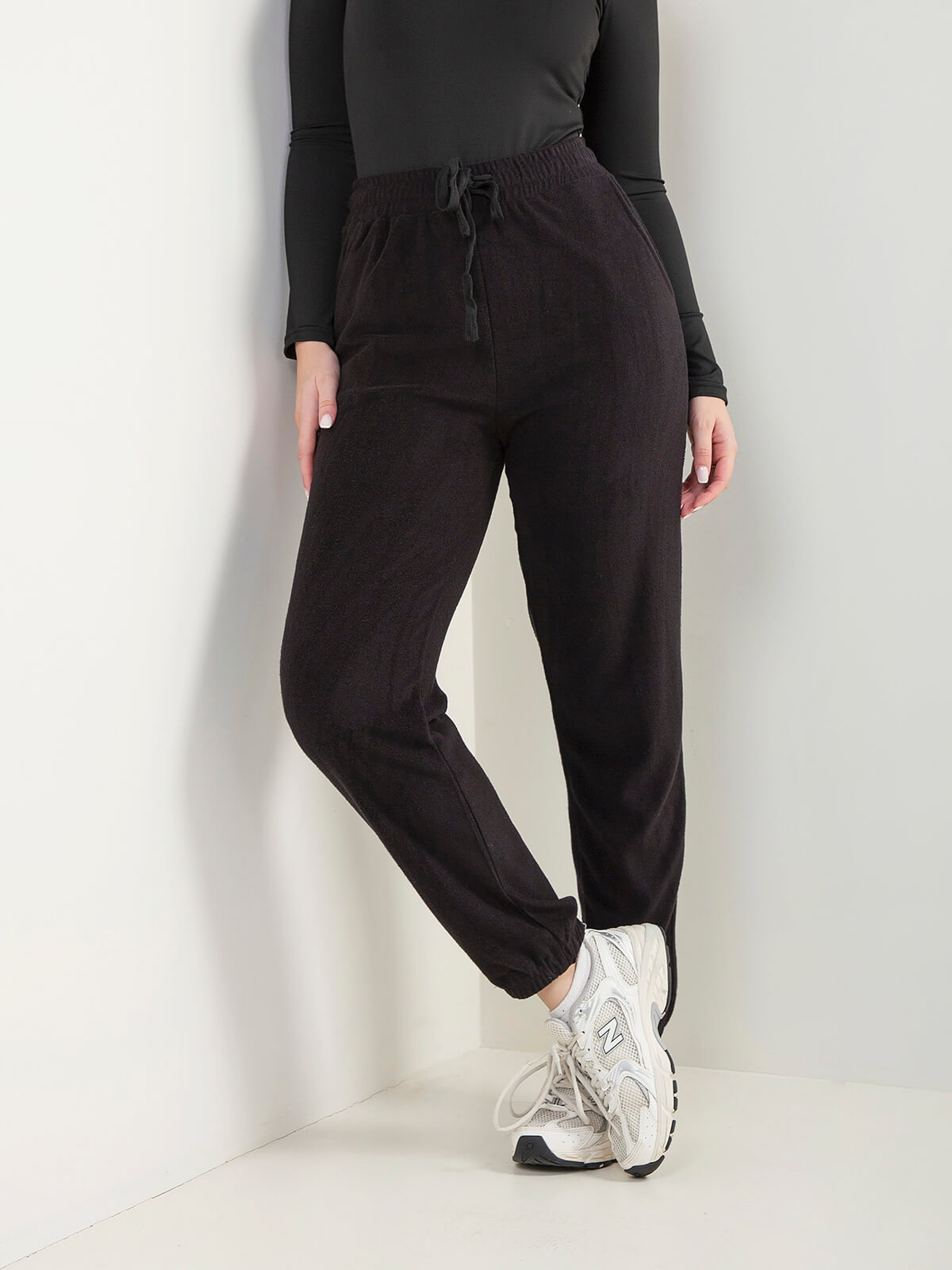 Calças jogger em malha com efeito aveludado, cintura alta com cordão e 2 bolsos laterais. Modelo confortável e perfeito para looks do dia a dia.