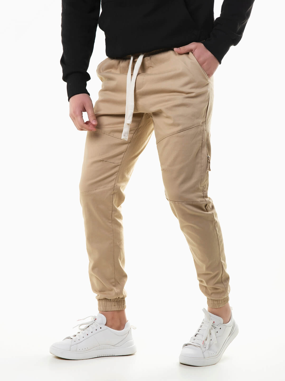 Calças jogger de sarja com três bolsos e um com fecho. Calças para homem com cintura e punhos elásticos. Cordão para ajustar.