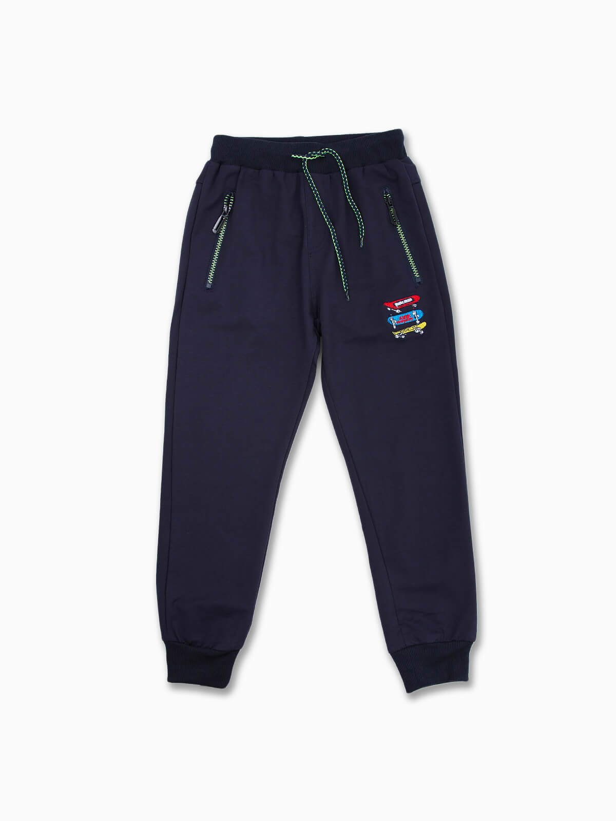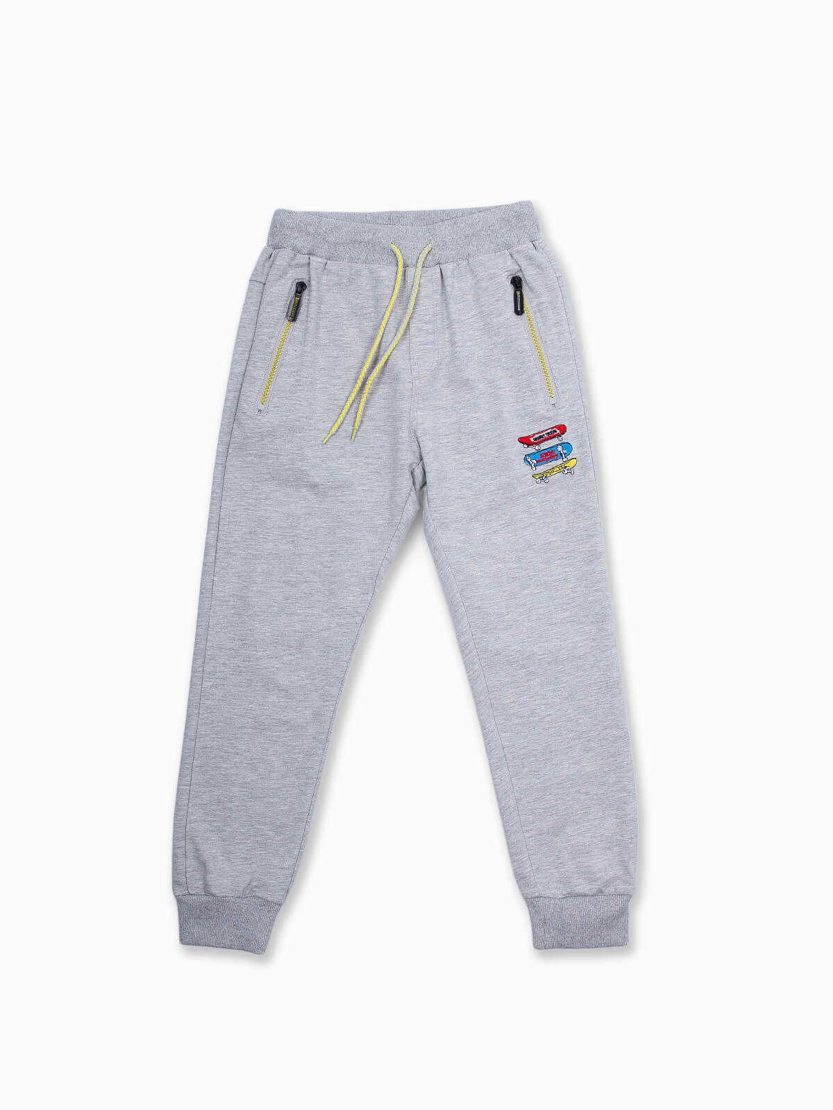 Calças jogger com skates bordados para menino. Calças de felpa com dois bolsos e um posterior. Punhos elásticos. Cintura com cordão para ajustar.