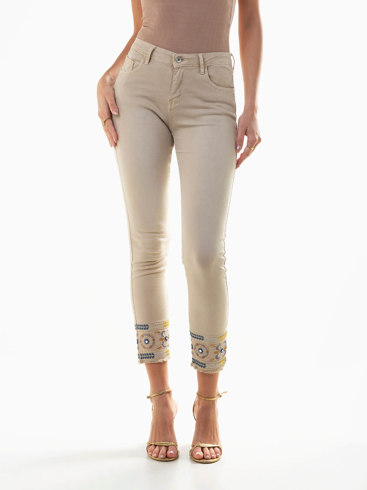 Calças justas com bordados nos punhos em contraste. Calças sarja elástica com cintura alta e 5 bolsos. Aperto de fecho éclair e botão.
