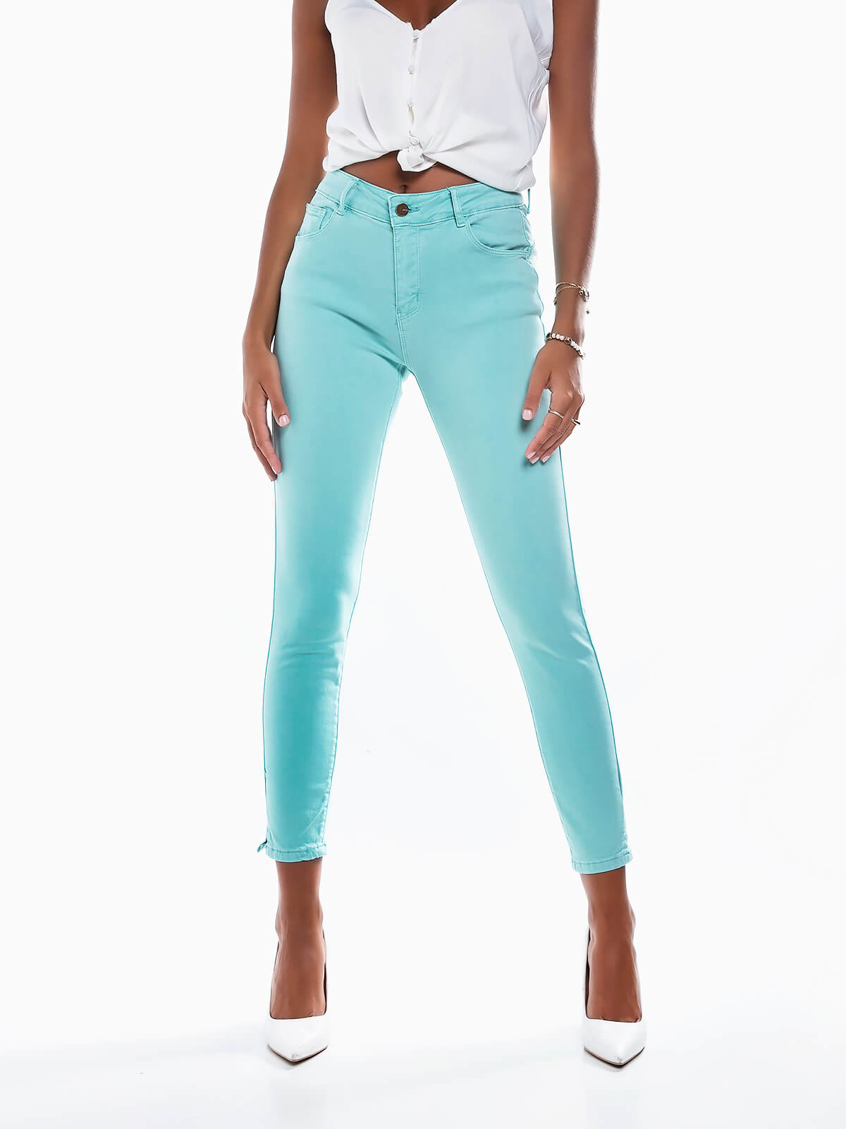 Calças justas de ganga de cintura alta para senhora. Calças com efeito push-up e pormenor de aberturas na base. 5 bolsos. Aperto de fecho éclair e botão.
