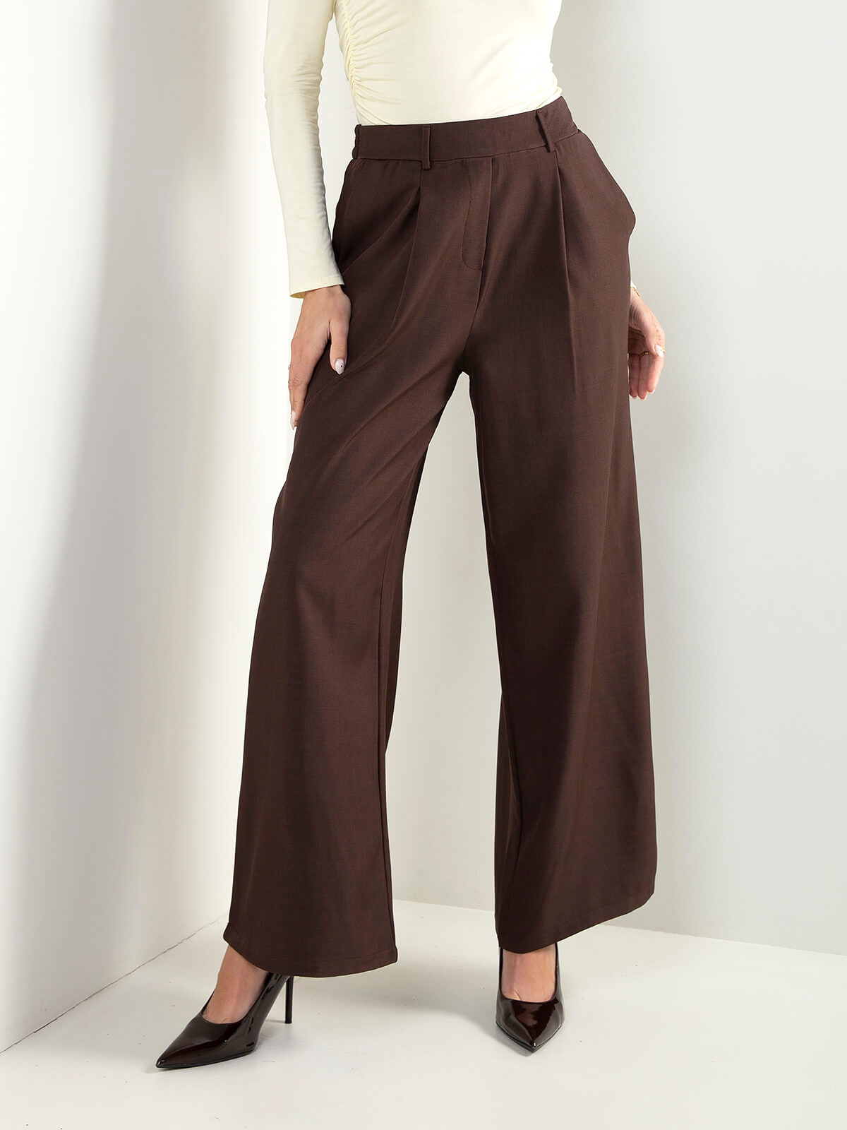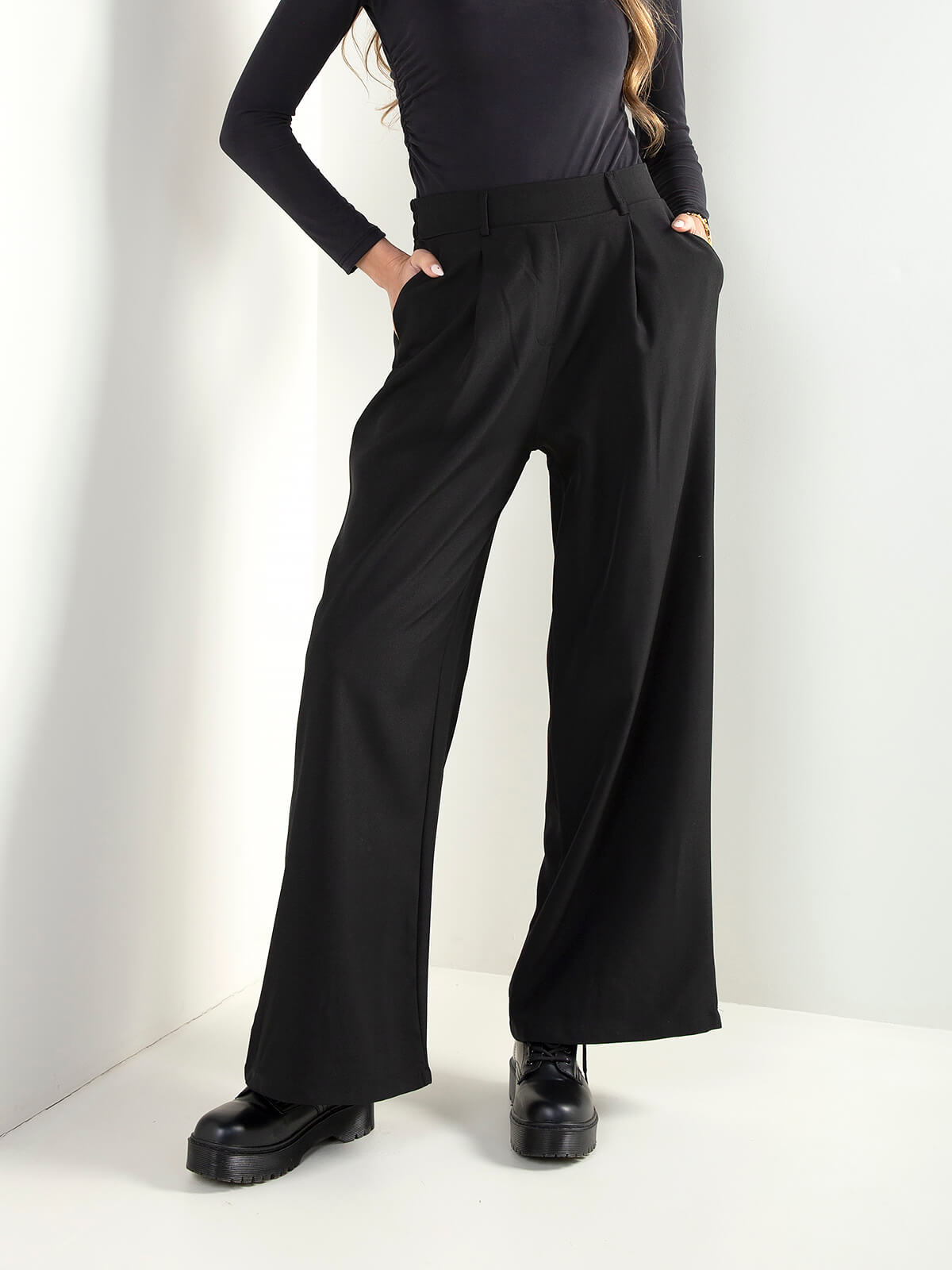 Calças de alfaiataria com corte wide leg e pregas frontais. Modelo de cintura subida com bolsos laterais e fecho discreto. Caimento leve e elegante, ideal para looks mais sofisticados ou combinações do dia a dia com um toque mais cuidado.
