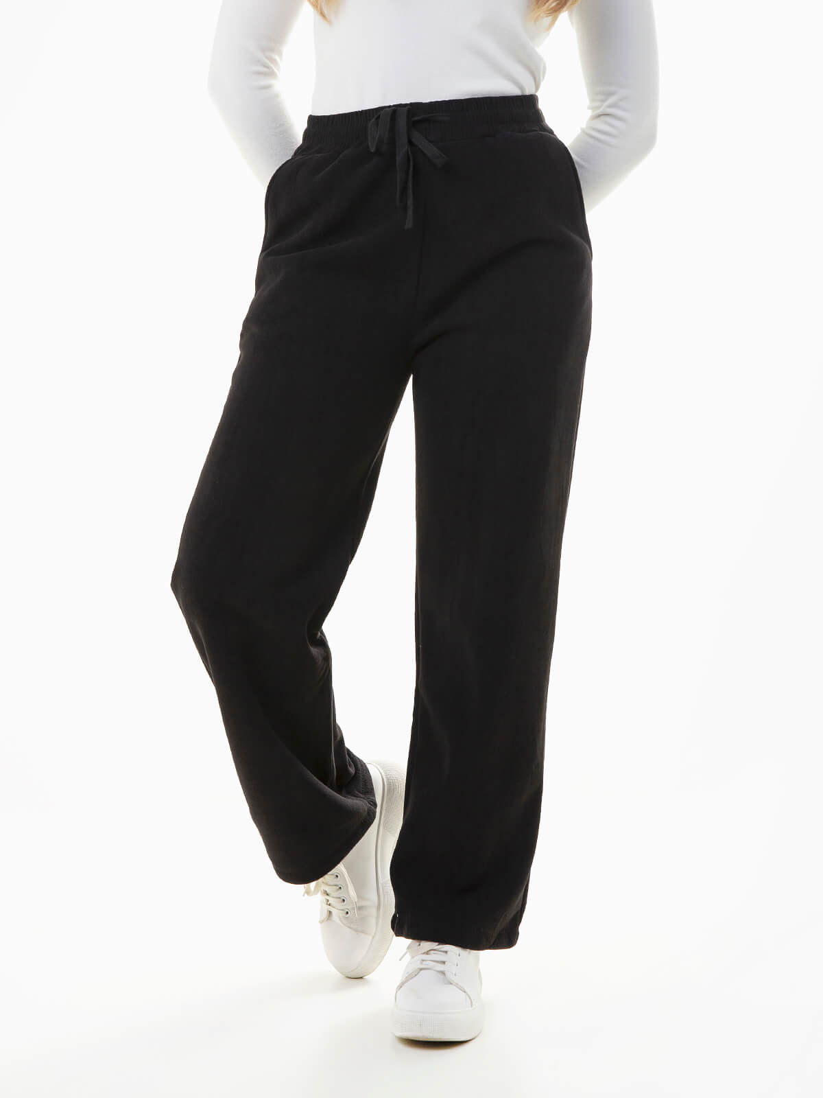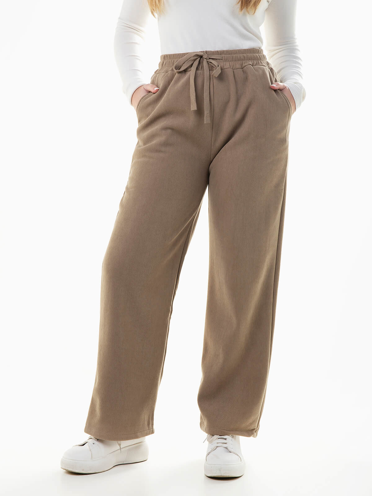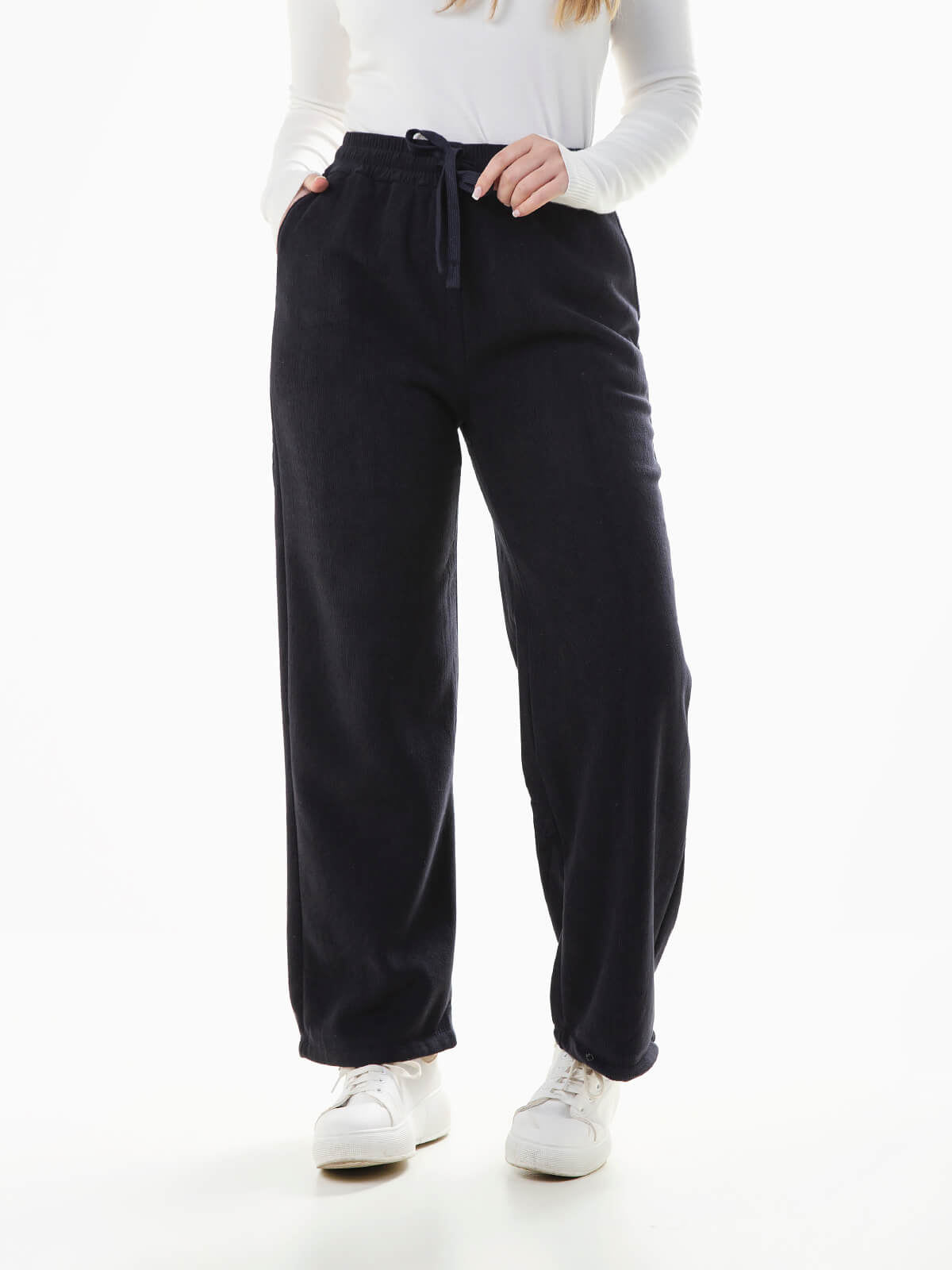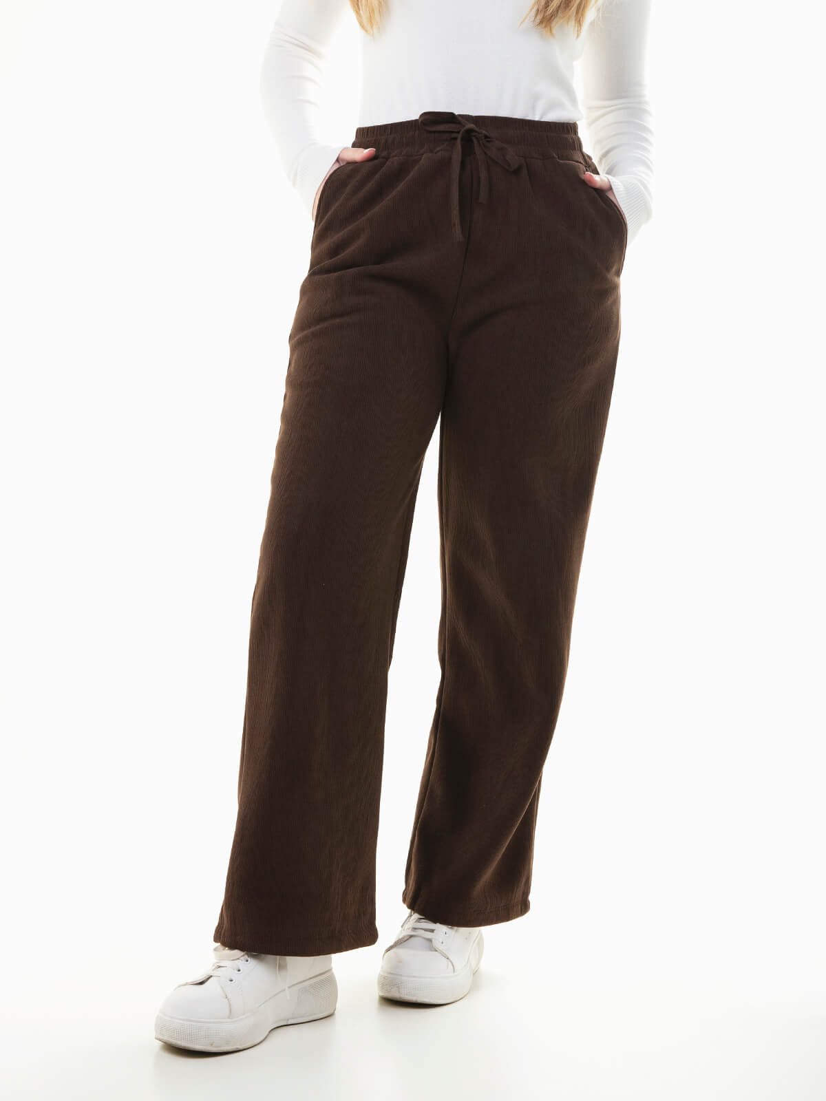 Calças largas com efeito bombazina para senhora. Calças de cintura alta com cordão para ajustar e 2 bolsos. Interior cardado.